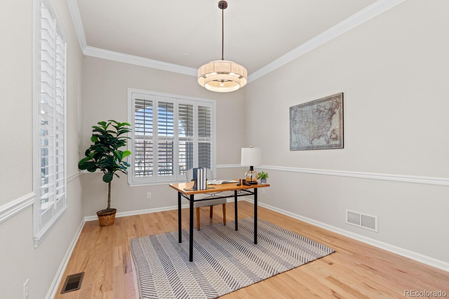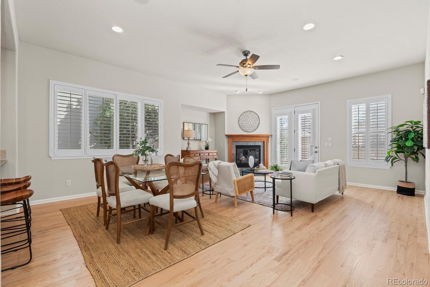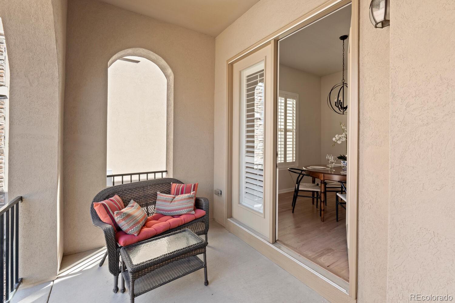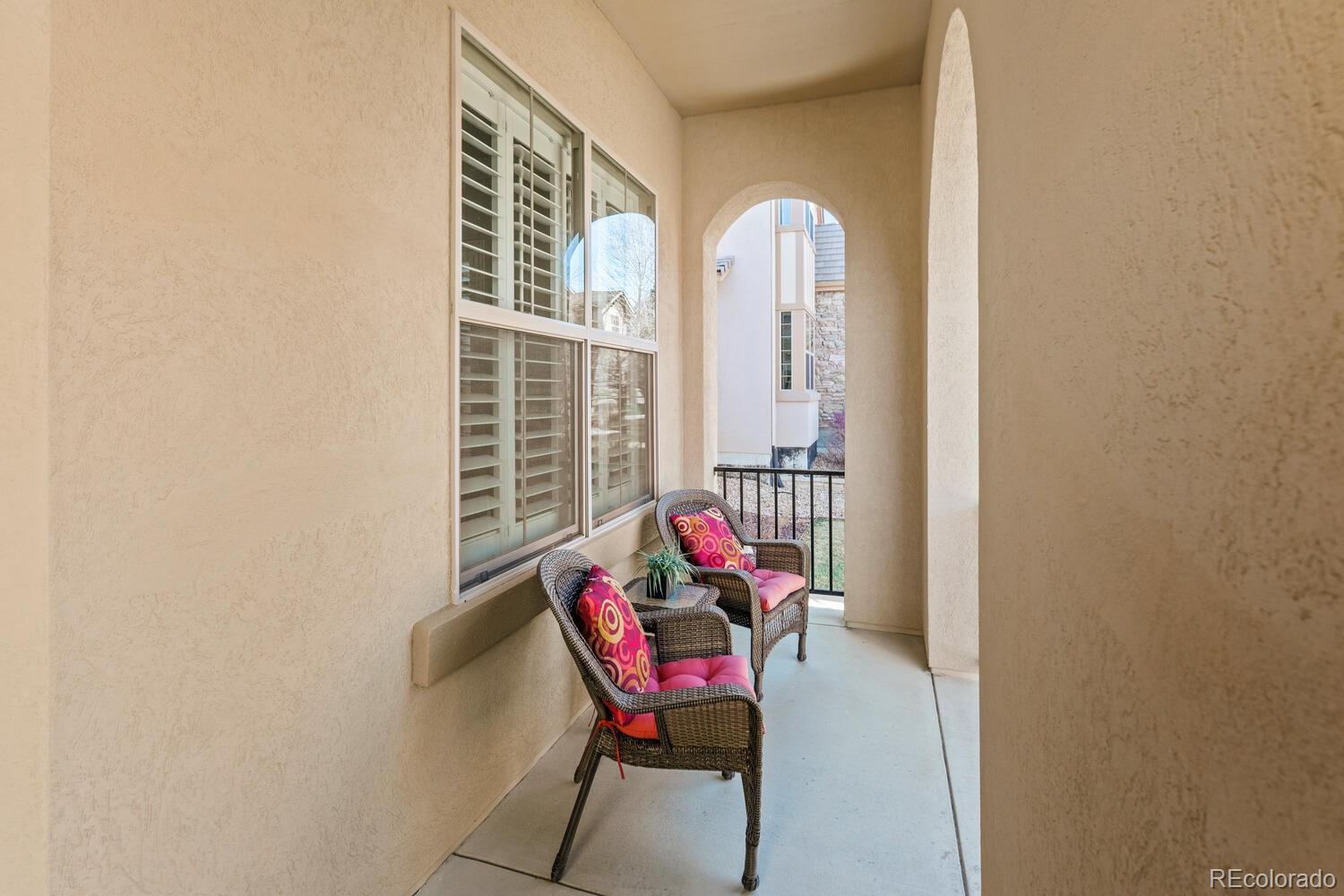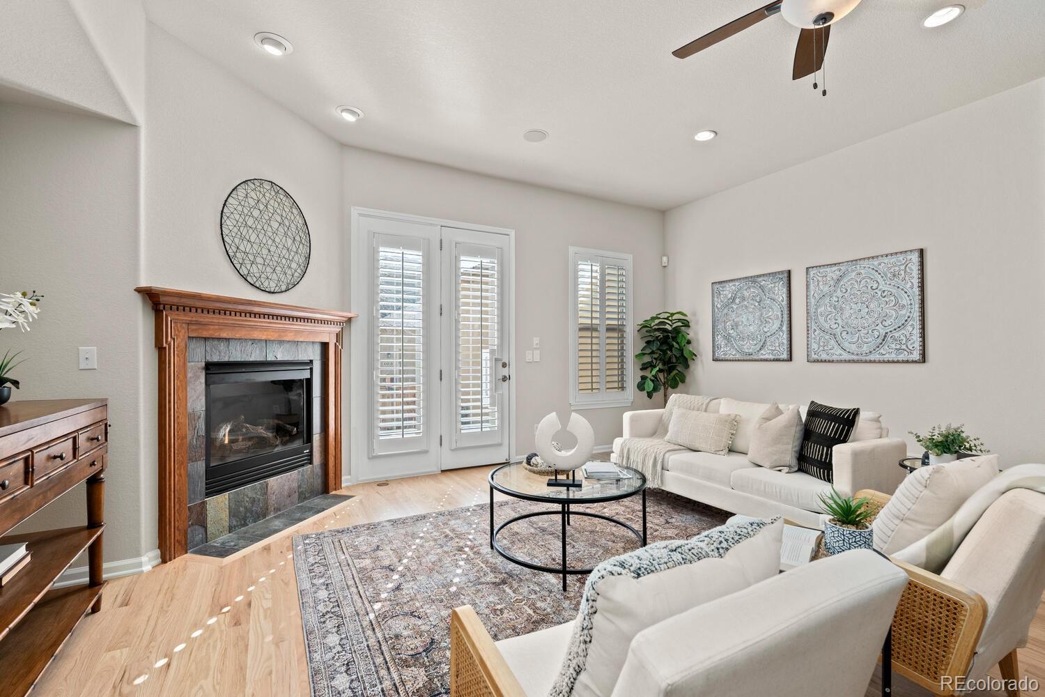 Enjoy a true lock-and-leave lifestyle in this beautifully maintained Toll Brothers patio home featuring a main-level primary suite with a luxurious five-piece bath. Thoughtfully updated and move-in ready, the home showcases newly finished hardwood floors throughout the main living areas, new carpeting, fresh exterior paint, and stylish designer lighting.The kitchen is designed for both everyday living and entertaining, offering rich cherry cabinetry, granite countertops, a large center island, and stainless-steel appliances including a five-burner gas cooktop. The adjoining breakfast area opens to a charming covered patio overlooking a courtyard--perfect for morning coffee or casual dining. The spacious great room features new hardwood floors and a cozy gas fireplace, flowing to the private fenced backyard. Step outside to a brand-new stamped concrete patio with a gas line and low-maintenance turf--an ideal setting for relaxing or entertaining. A generous main-floor study offers a perfect work-from-home space, and plantation shutters are found throughout.Upstairs are three spacious bedrooms--each with walk-in closets--plus a versatile loft ideal for a media room or play space. The unfinished basement with nine-foot ceilings provides excellent storage and future finishing potential. Additional comforts include a whole-house humidifier, commercial-grade recovery water heater, and a hot water recirculation line for instant hot water to all faucets. Ideally located at the base of Bluffs Regional Park Trail with access to over 40 miles of trails and minutes from Lone Tree Recreation Center and Lone Tree Arts Center. Commuting is easy with quick access to Interstate 25, E-470, and C-470. Conveniently located near the award-winning Sky Ridge Medical Center, offering exceptional healthcare just minutes away. Don't miss this rare combination of comfort, convenience, and low-maintenance living in a highly desirable location.