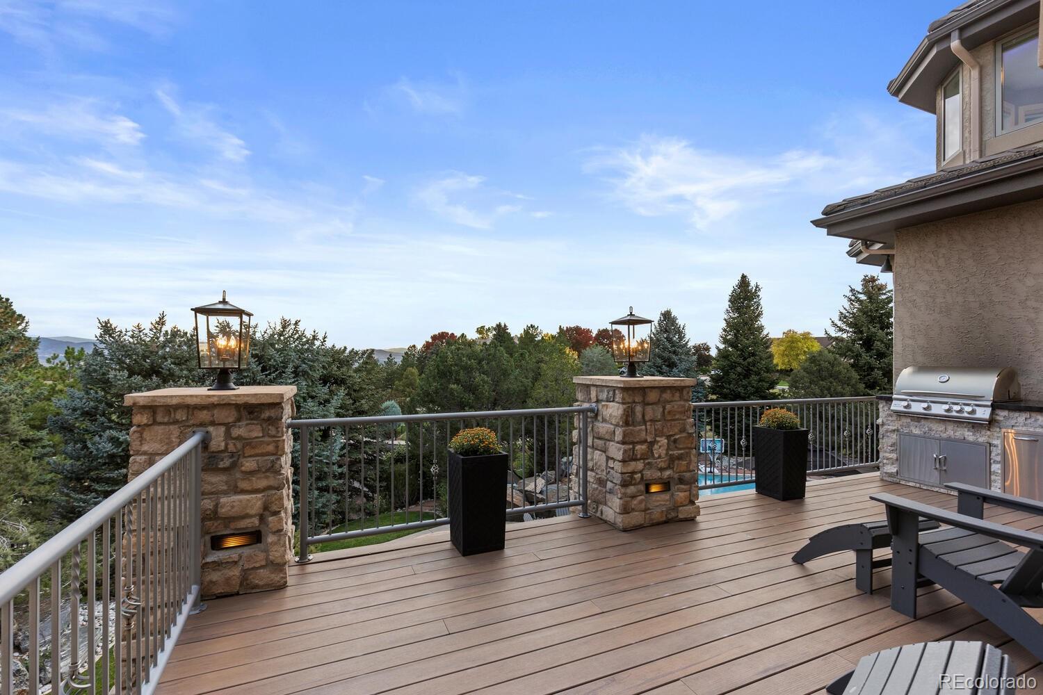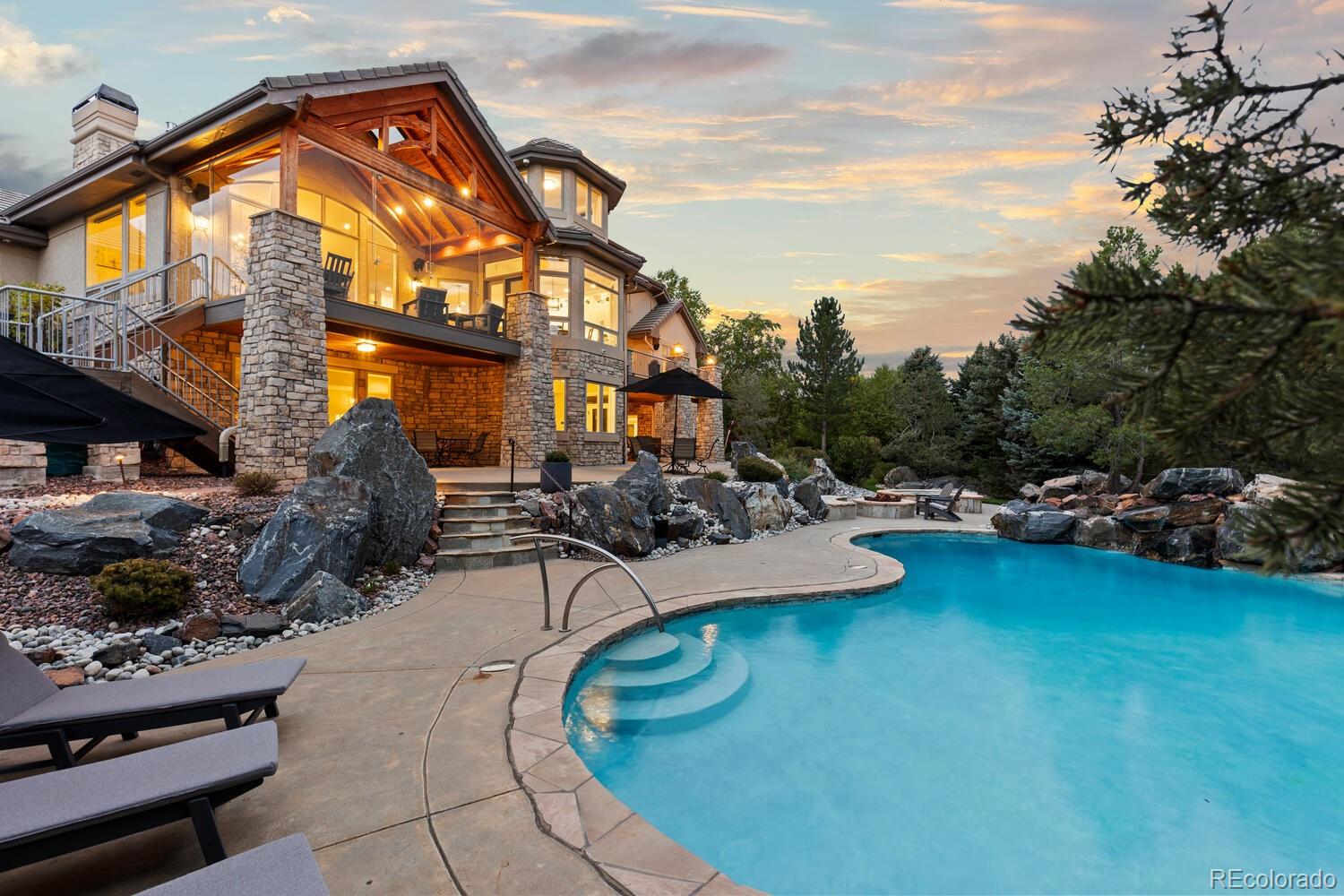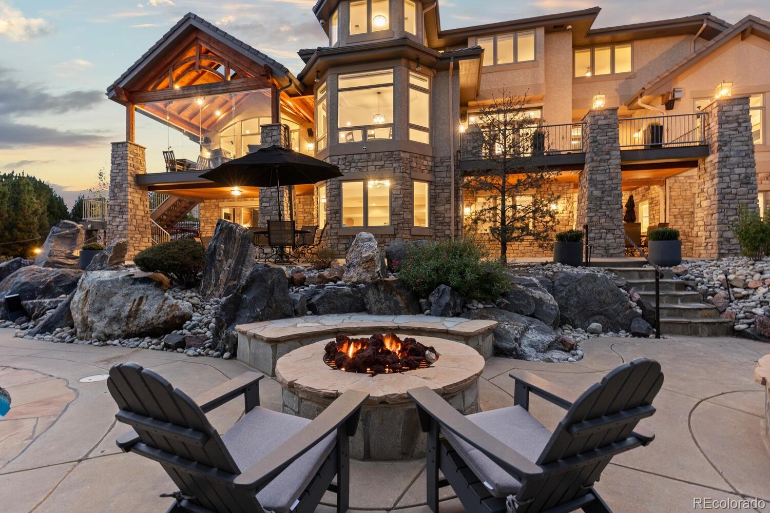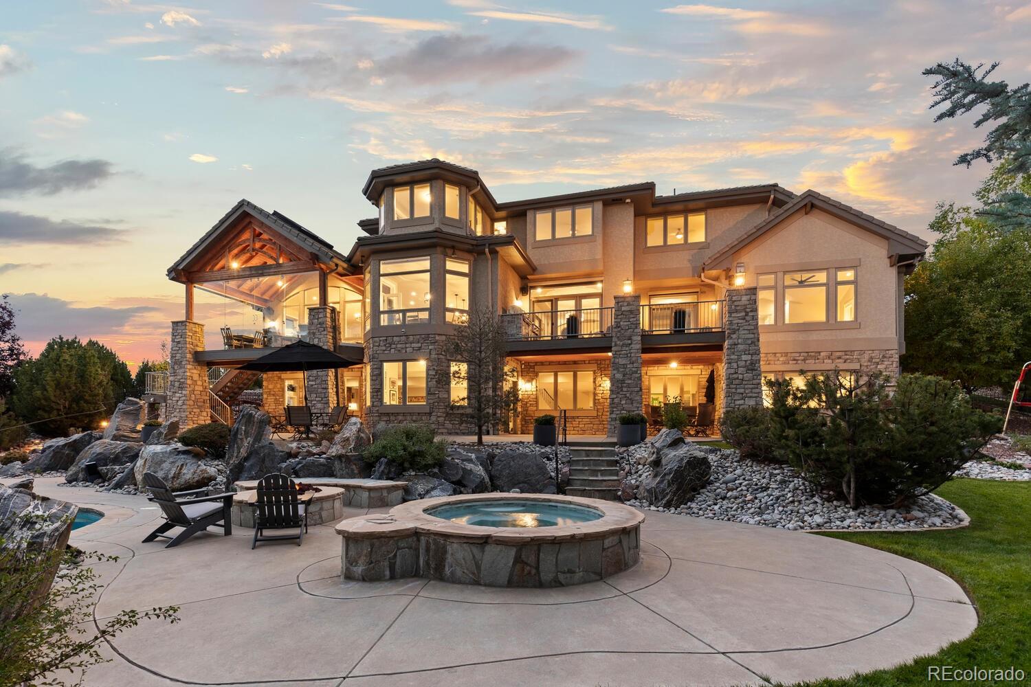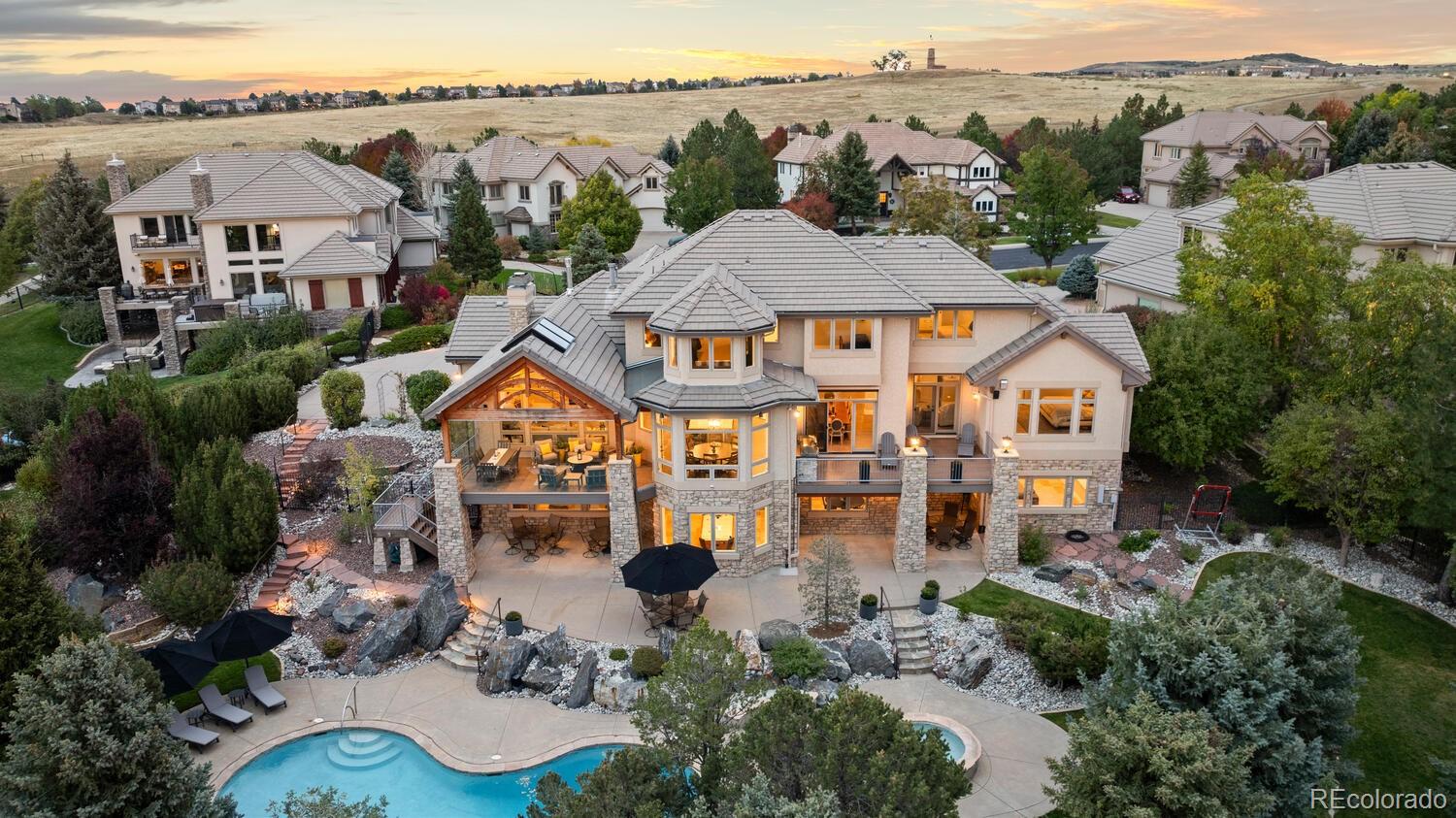 Experience Colorado luxury at its finest in this beautifully remodeled, custom-built estate in one of Highlands Ranch's most prestigious gated communities, The Highwoods. Situated on a meticulously landscaped 0.72-acre lot, this exceptional home offers breathtaking mountain views, resort-style outdoor living, and a floorplan blending timeless elegance with everyday comfort. The backyard is an entertainer's dream with a sparkling pool, relaxing spa, built-in fire pit, and panoramic mountain views. A large grassy area below the pool provides extra space for kids and dogs to play, making this outdoor retreat both beautiful and practical. Inside, handcrafted hardwood floors and architectural details shine throughout. The stunning kitchen features a large center island, custom white cabinetry, quartz countertops, Wolf double ovens, a 6-burner Viking gas cooktop, and built-in Sub-Zero refrigerator. It opens to a spacious family room with a cozy fireplace--perfect for entertaining or quiet nights. The main-floor primary suite offers a two-sided gas fireplace, sitting area, and dual custom walk-in closets. The luxuriously remodeled ensuite bath includes a soaking tub, heated tile floors, and a walk-in steam shower. Expansive decks one enclosed in custom glass, and one with built-in grill are ideal for enjoying Colorado's stunning sunsets. Upstairs are three generous bedroom suites, each with private baths and stunning mountain views. The finished walk-out basement expands living space dramatically, featuring a large guest bedroom, full bath, and home gym. The open-concept entertaining area includes a stylish wet bar and large gaming/family room that opens to outdoor living spaces--ideal for gatherings, game nights, or multi-generational living. Every inch of this home is updated with high-end finishes that complement its timeless design. From views and layout to luxurious outdoor features, this home epitomizes Colorado luxury living.