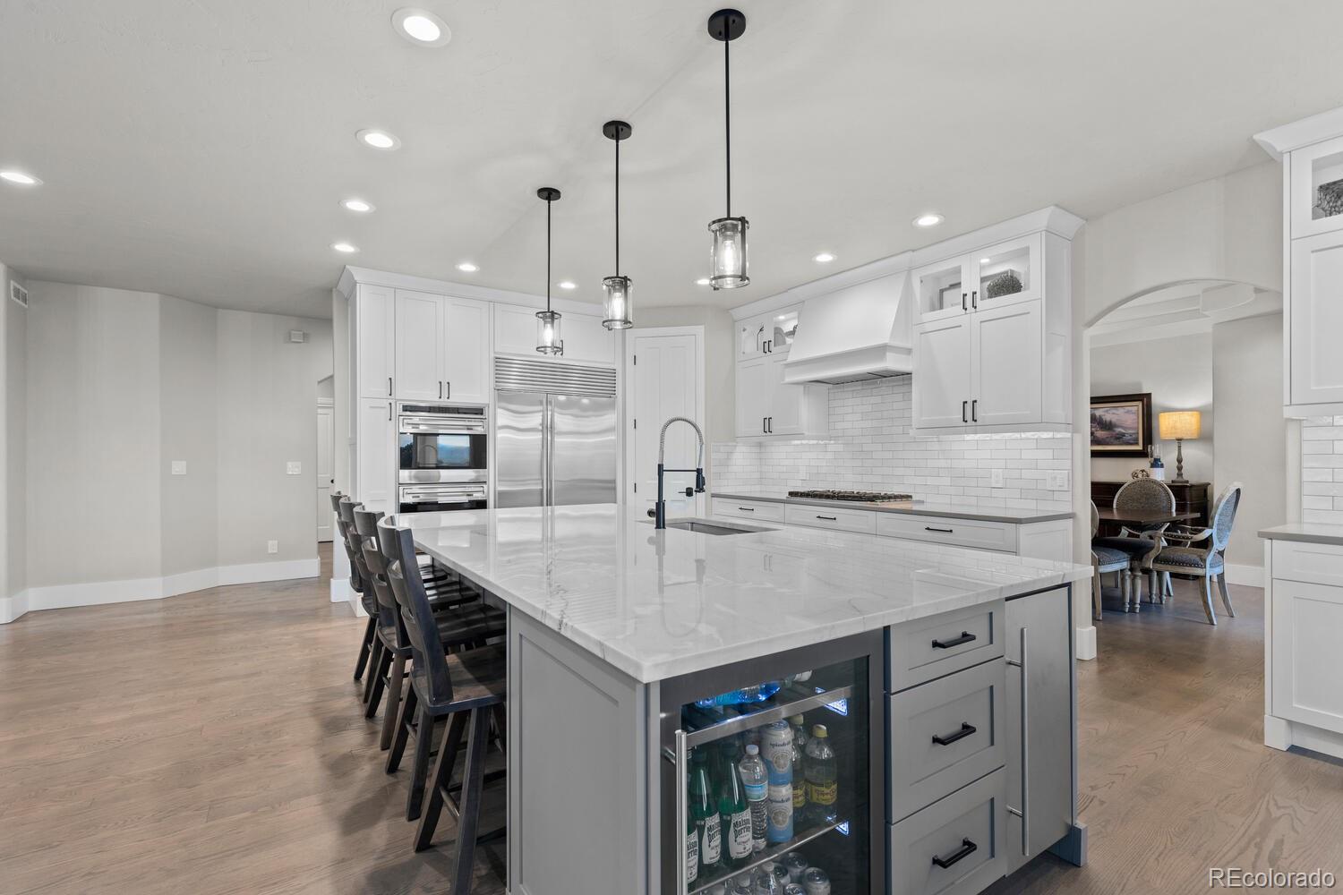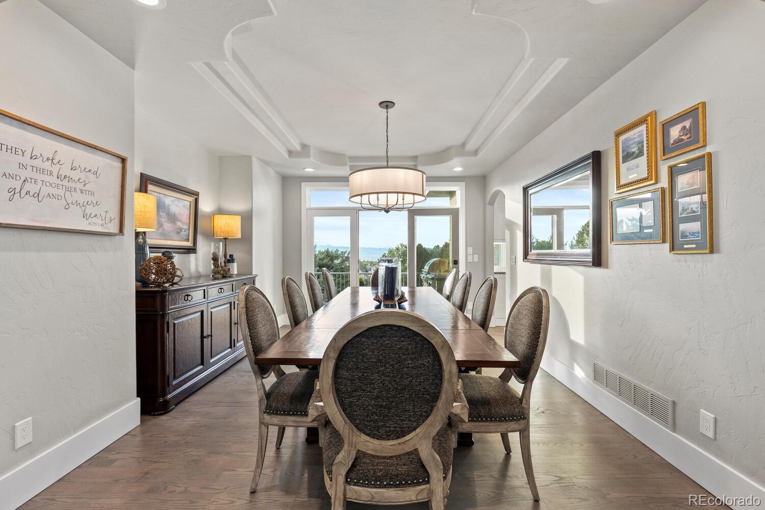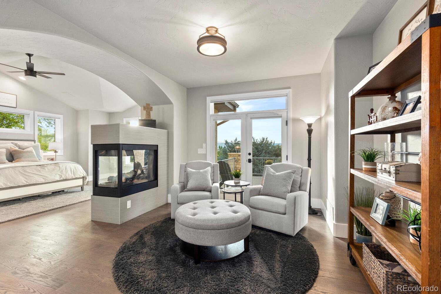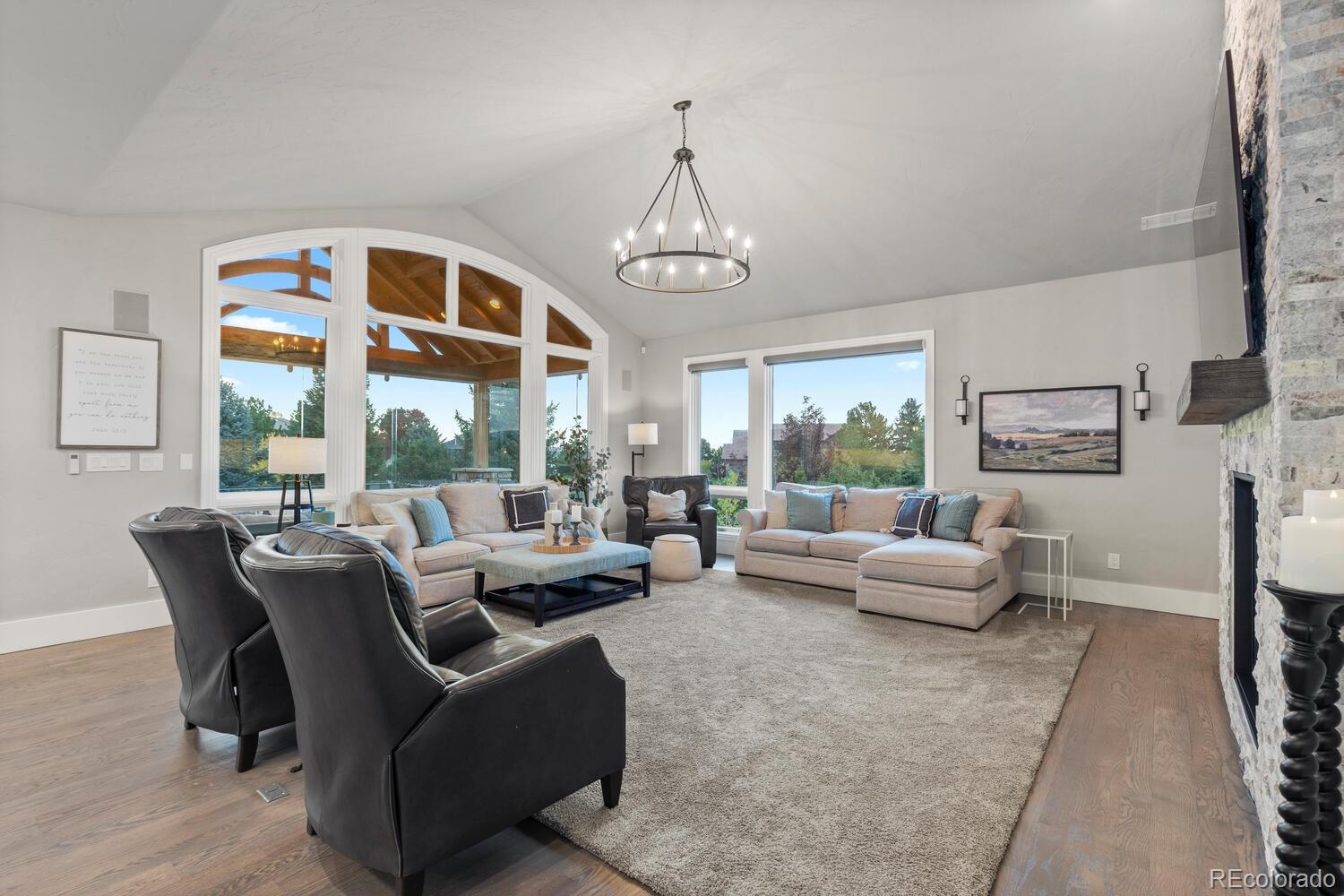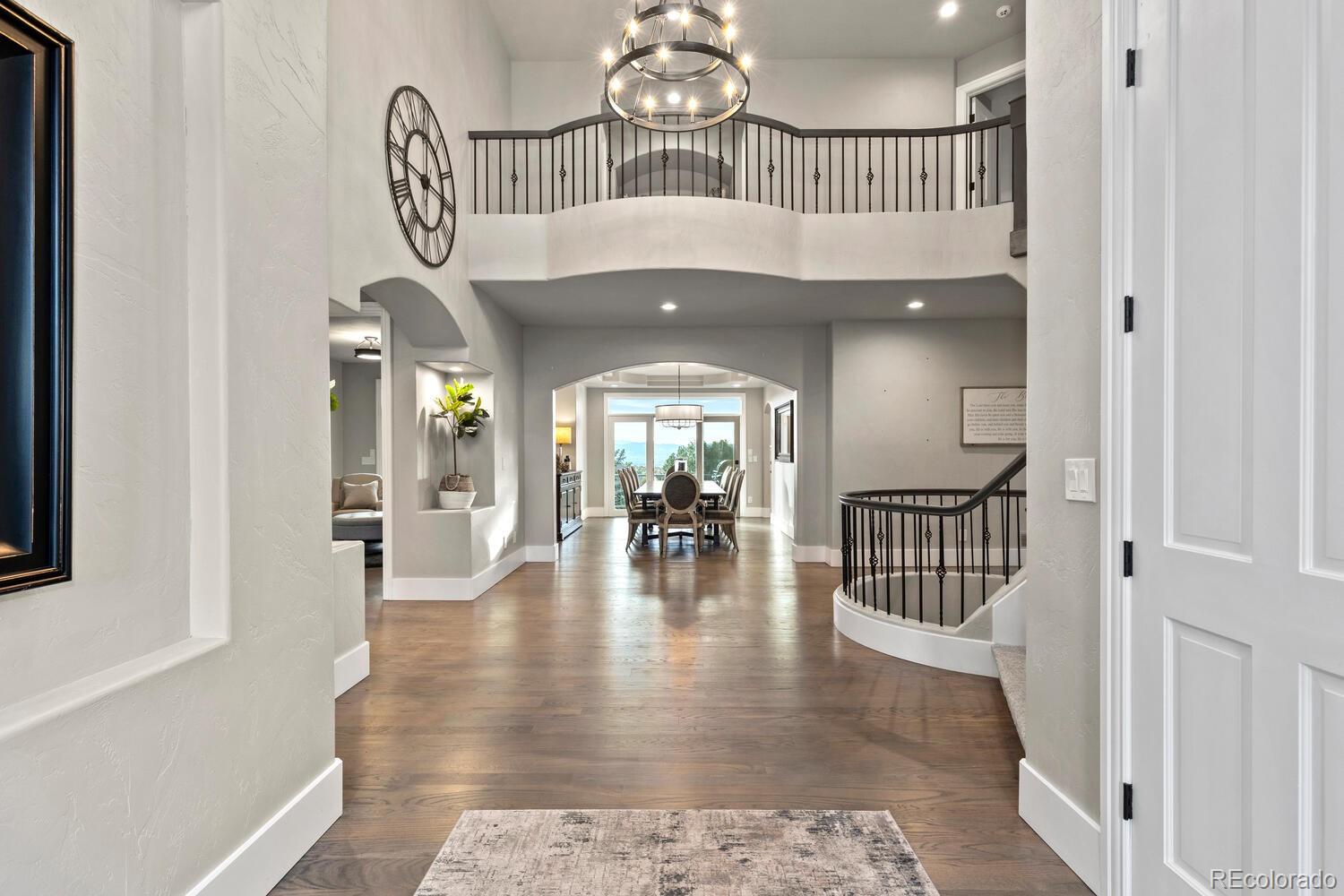 Experience Colorado luxury at its finest in this beautifully remodeled, custom-built estate in one of Highlands Ranch's most prestigious gated communities, The Highwoods. Situated on a meticulously landscaped 0.72-acre lot, this exceptional home offers breathtaking mountain views, resort-style outdoor living, and a floorplan blending timeless elegance with everyday comfort. The backyard is an entertainer's dream with a sparkling pool, relaxing spa, built-in fire pit, and panoramic mountain views. A large grassy area below the pool provides extra space for kids and dogs to play, making this outdoor retreat both beautiful and practical. Inside, handcrafted hardwood floors and architectural details shine throughout. The stunning kitchen features a large center island, custom white cabinetry, quartz countertops, Wolf double ovens, a 6-burner Viking gas cooktop, and built-in Sub-Zero refrigerator. It opens to a spacious family room with a cozy fireplace--perfect for entertaining or quiet nights. The main-floor primary suite offers a two-sided gas fireplace, sitting area, and dual custom walk-in closets. The luxuriously remodeled ensuite bath includes a soaking tub, heated tile floors, and a walk-in steam shower. Expansive decks one enclosed in custom glass, and one with built-in grill are ideal for enjoying Colorado's stunning sunsets. Upstairs are three generous bedroom suites, each with private baths and stunning mountain views. The finished walk-out basement expands living space dramatically, featuring a large guest bedroom, full bath, and home gym. The open-concept entertaining area includes a stylish wet bar and large gaming/family room that opens to outdoor living spaces--ideal for gatherings, game nights, or multi-generational living. Every inch of this home is updated with high-end finishes that complement its timeless design. From views and layout to luxurious outdoor features, this home epitomizes Colorado luxury living.