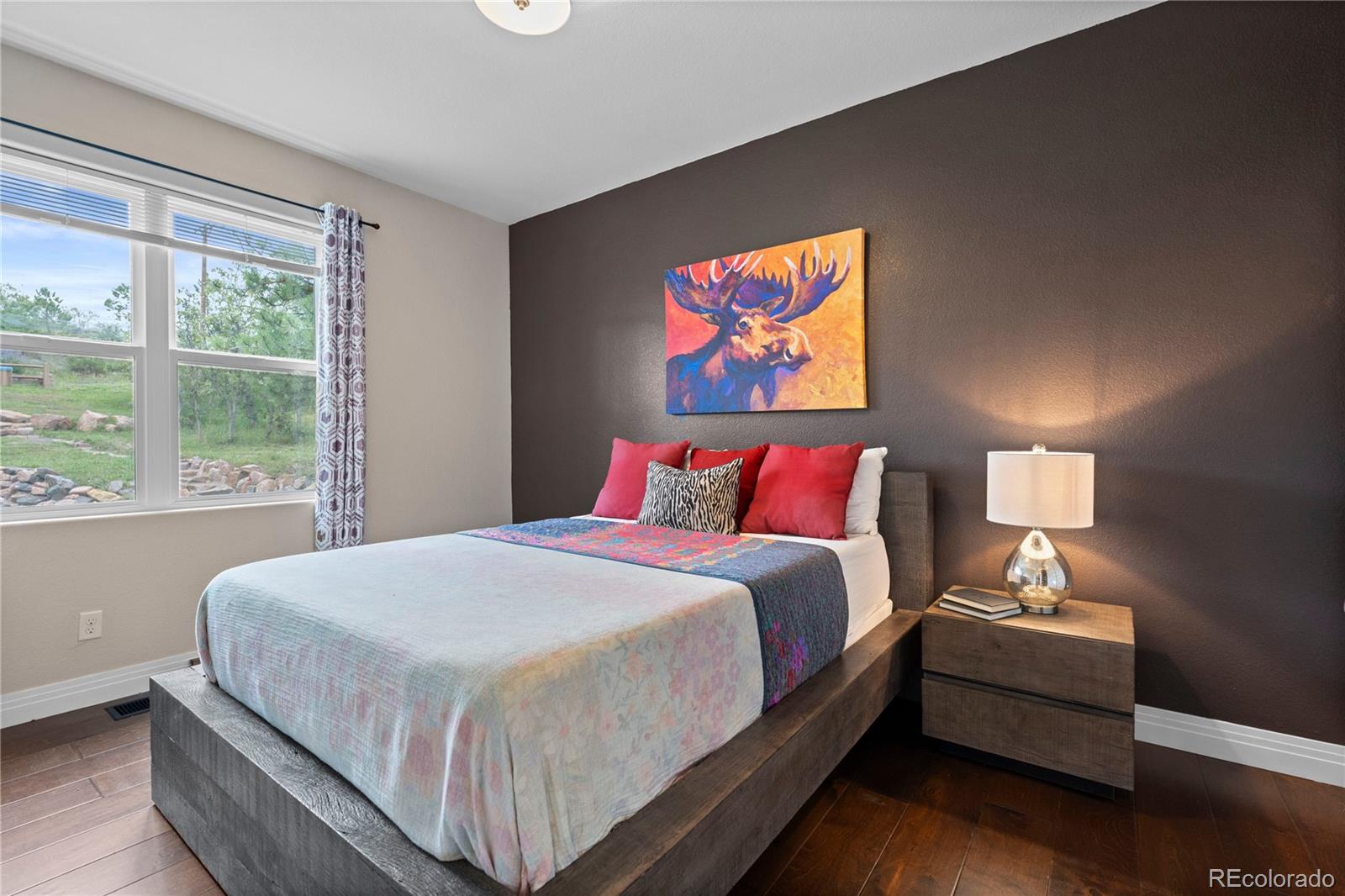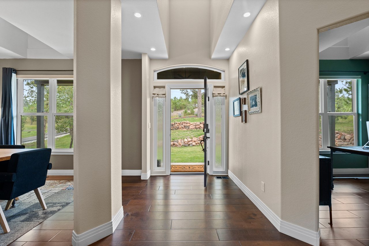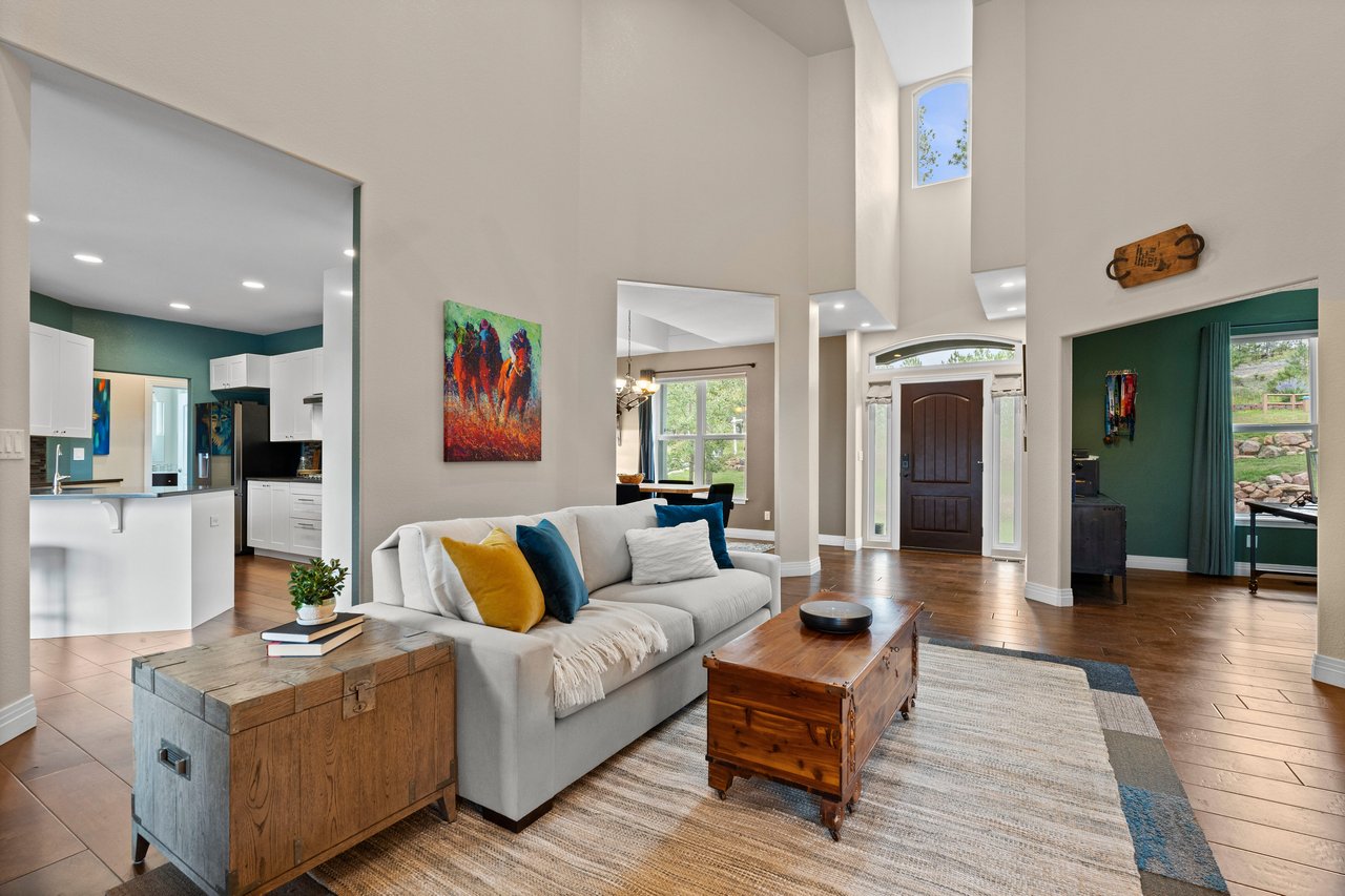 Inside, the bright, open floor plan is designed to showcase sweeping views of the Front Range and Bald Mountain. The vaulted great room impresses with soaring ceilings, a cozy fireplace, and expansive windows that frame the surrounding natural beauty.