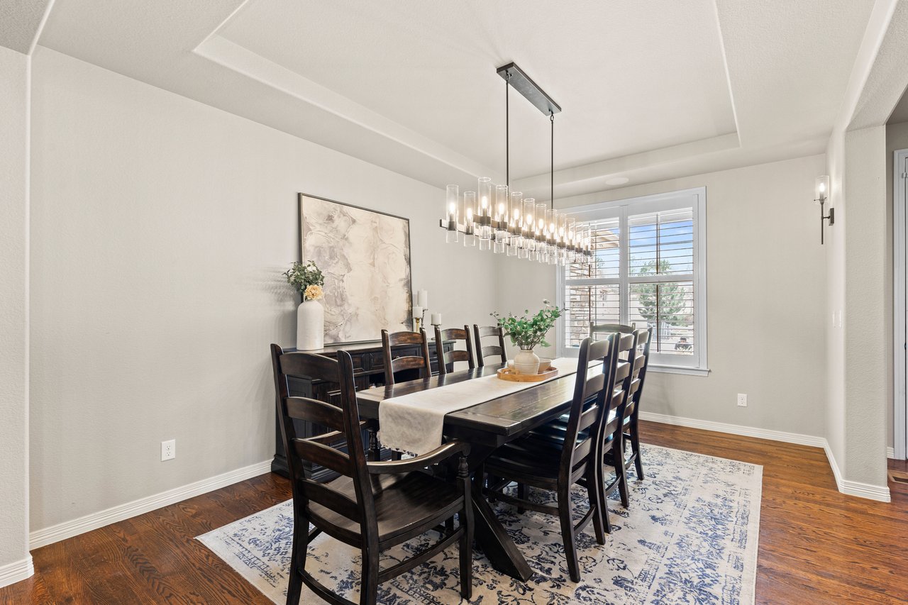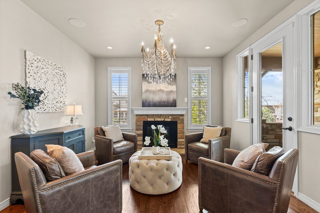 Ideally located in the heart of Backcountry, this sought-after Shea "Moonshadow" offers exceptional privacy plus mountain and downtown views. Situated on a premier corner lot backing to open space and trails, this home offers a fully fenced yard with lovely water feature. This home's floor plan lives as beautifully as it entertains. The main level unfolds with a natural sense of openness, where generous gathering spaces, a substantial gourmet kitchen, and covered outdoor living create an effortless rhythm for everyday life and hosting alike. At the center, the kitchen features a large island, classic cream cabinetry, slab granite countertops, double ovens, dual dishwashers a gas cooktop and warming drawer. Plantation shutters and wood floors enhance both warmth and privacy. A study with fireplace offers opens to the covered deck. The main floor also includes a private guest suite with its own bath, offering comfort and separation for visitors. Step outside to the wraparound covered patio with a fireplace and built-in BBQ--an inviting, secluded setting to relax, dine, and enjoy the peaceful surroundings. Upstairs, the bedroom layout offers both privacy and flexibility. A spacious loft with a balcony is an ideal secondary office or play room. The primary suite serves as a tranquil retreat with dual sinks and generous closets. The finished walk-out basement expands the home's living space with a focus on recreation and relaxation, featuring a large bar and rec area plus a family room with fireplace. An additional bedroom (or exercise room), and a full bath round out this level. Set within the gated Backcountry community, residents enjoy access to the neighborhood's clubhouse, pool, spa, fitness center, and extensive trail system. From quiet mornings with mountain views to evenings filled with friends, firelight, and open-air dining, the lifestyle here is equal parts refined and relaxed.