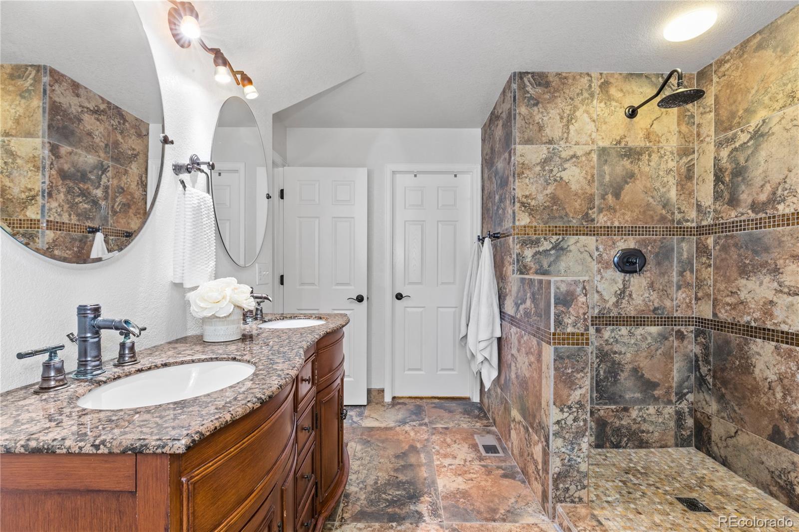 This well-maintained and delightful home at Hidden River in the heart of Parker is ready for its next lucky owner! Upon entering, you'll notice the welcoming floor plan and numerous upgrades throughout. A spacious eat-in kitchen features stainless steel appliances and room for everyday living and entertaining opening to the custom-stamped patio and fenced backyard. The inviting family room includes a cozy brick fireplace. Head upstairs to the luxurious primary suite complete with three-way fireplace, 5-piece bathroom featuring heated floors, roman soaking tub and double sinks set in granite. Two additional upstairs bedrooms and a custom bathroom complete the upstairs living area. Back downstairs, a recently professionally finished basement boasts an extra bedroom and half bathroom for even more livable space in this home. Don't miss the extra tall garage interior for even more added storage while recently installed solar panels as well as new paint finish off many upgrades. This home won't stay on the market for long!