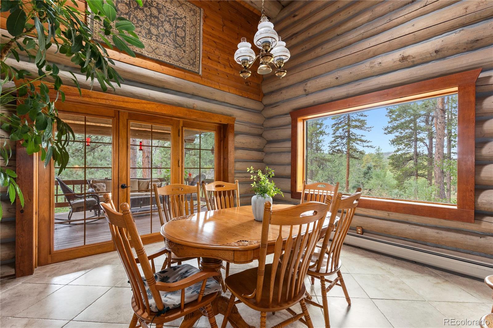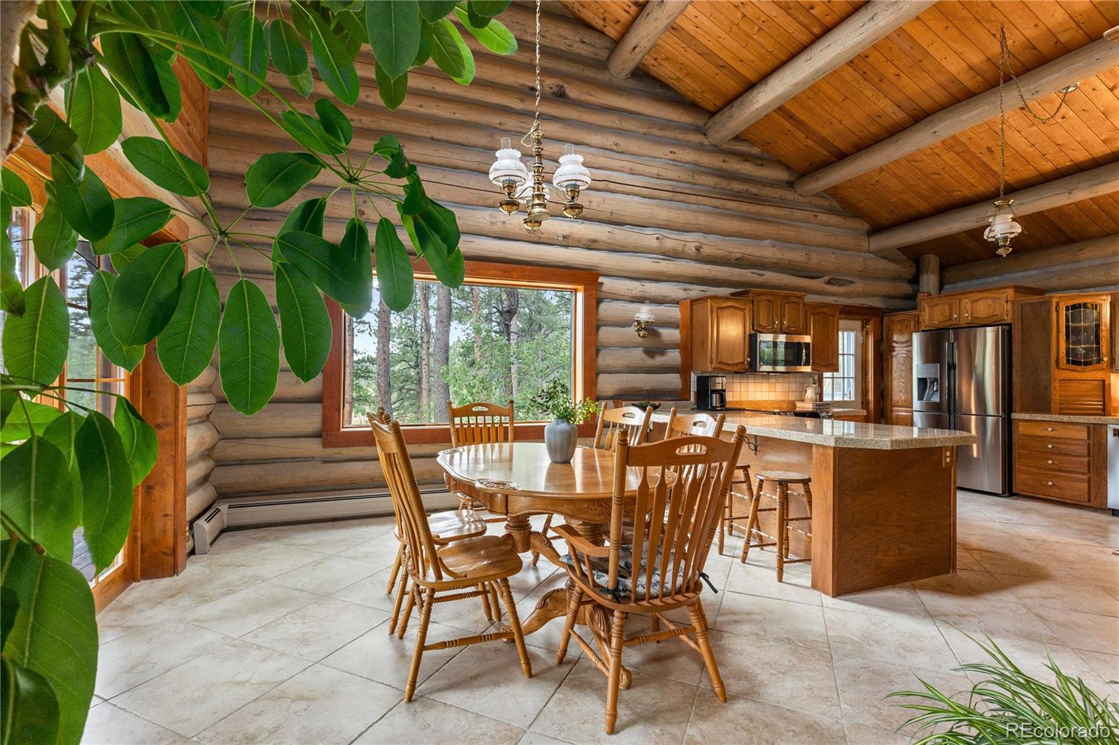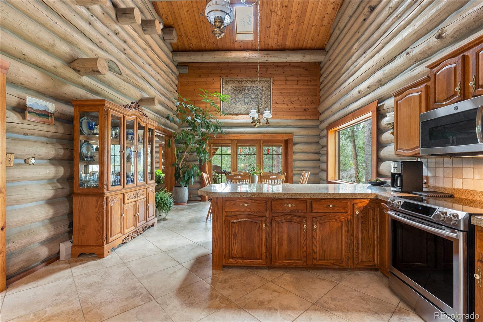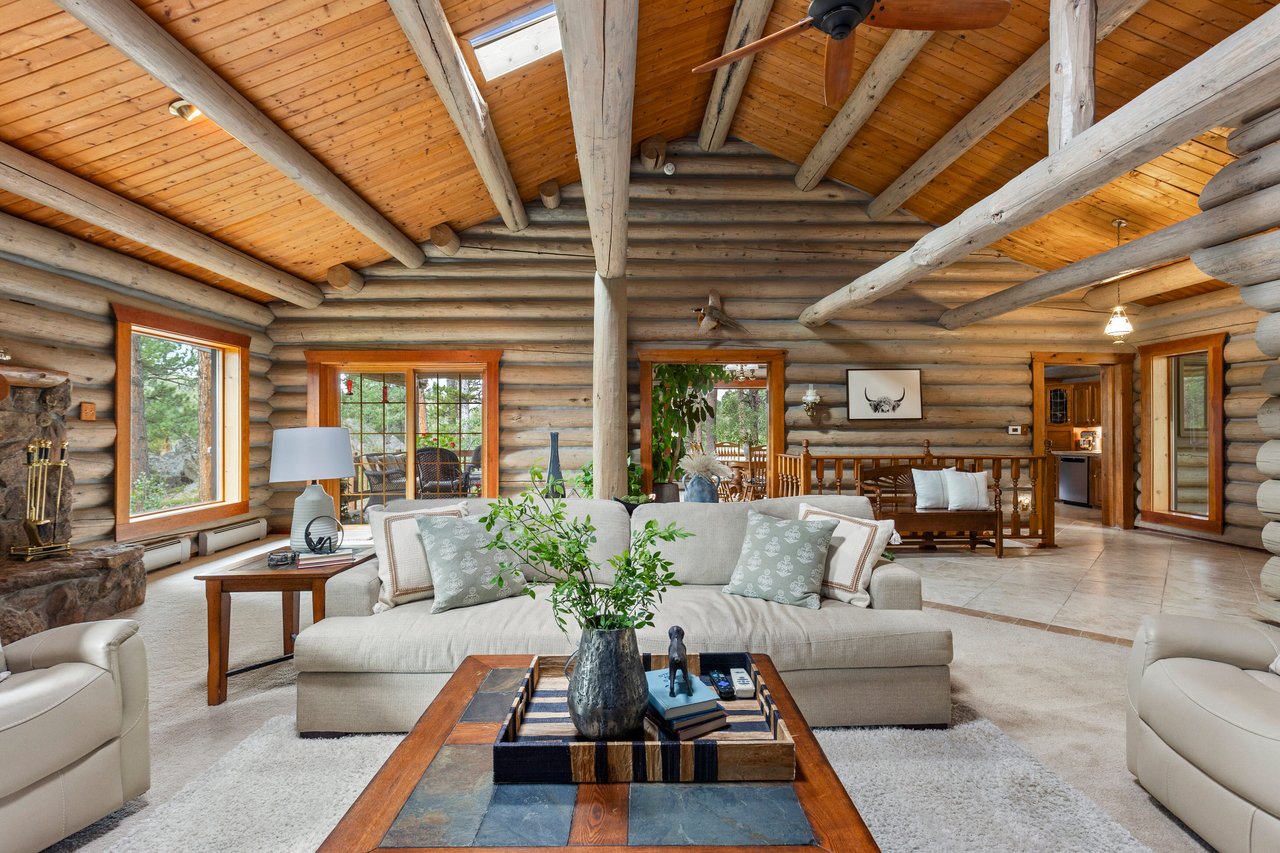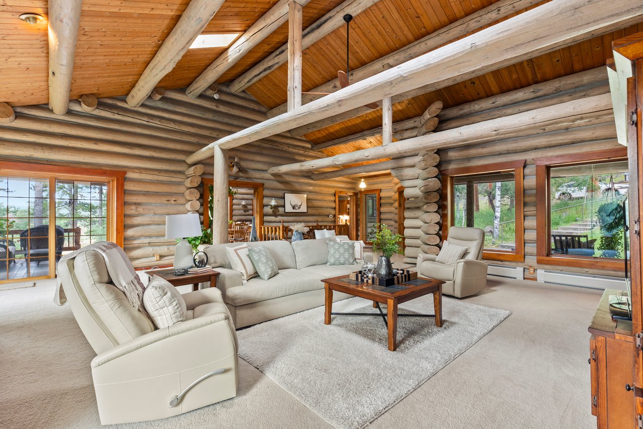 The main level boasts soaring ceilings, large windows, and skylights that flood the home with natural light and showcase the surrounding scenery. A spacious kitchen with dining area and patio access makes entertaining easy, while the open floor plan highlights the home's warmth and functionality.