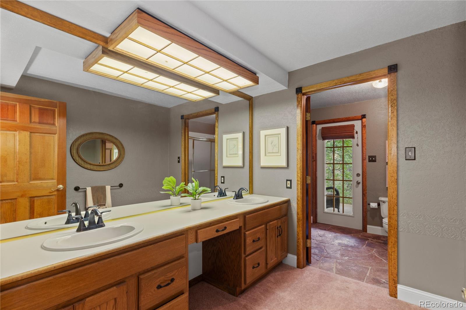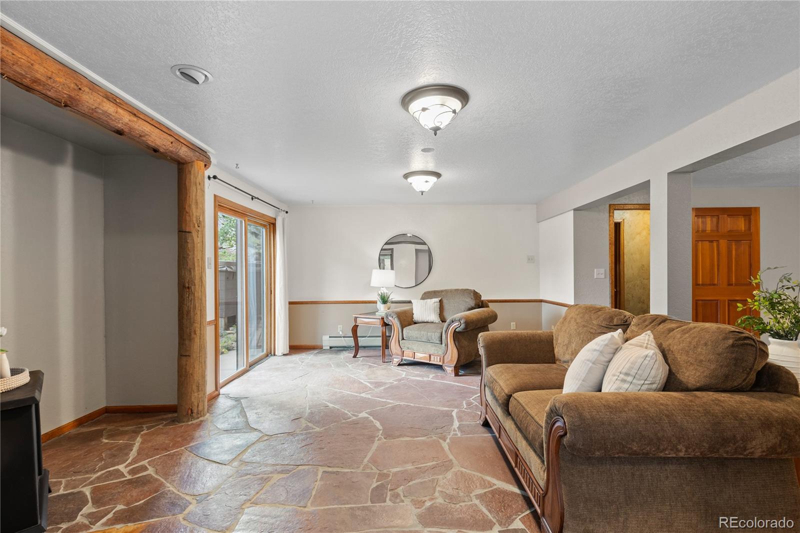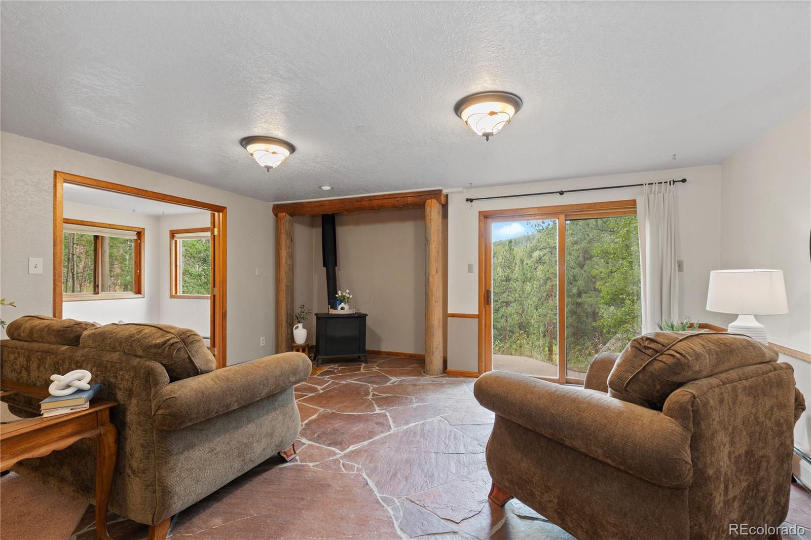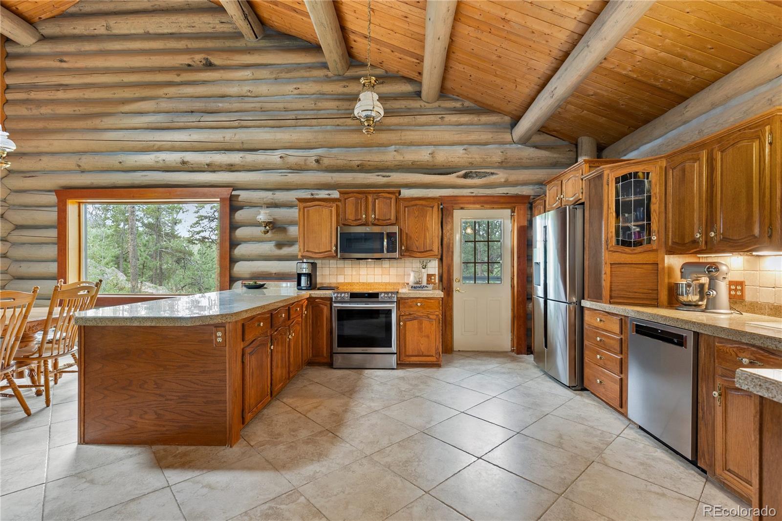 The main level boasts soaring ceilings, large windows, and skylights that flood the home with natural light and showcase the surrounding scenery. A spacious kitchen with dining area and patio access makes entertaining easy, while the open floor plan highlights the home's warmth and functionality.