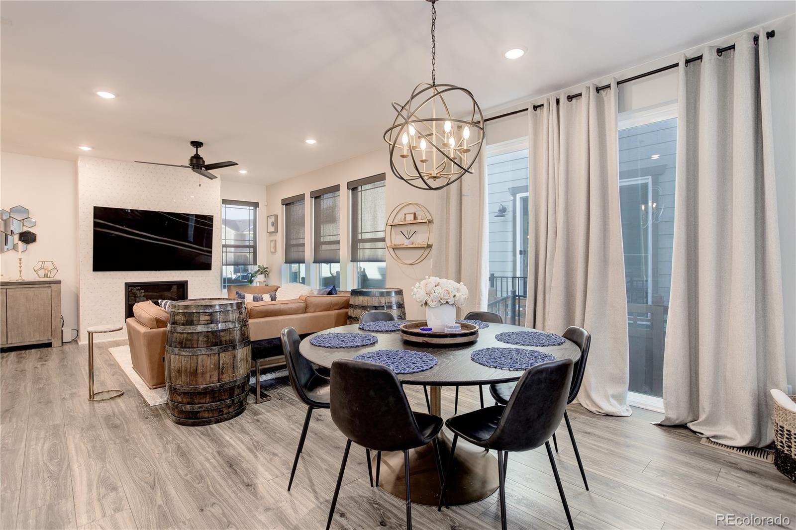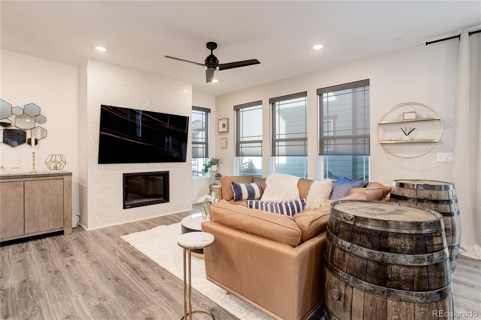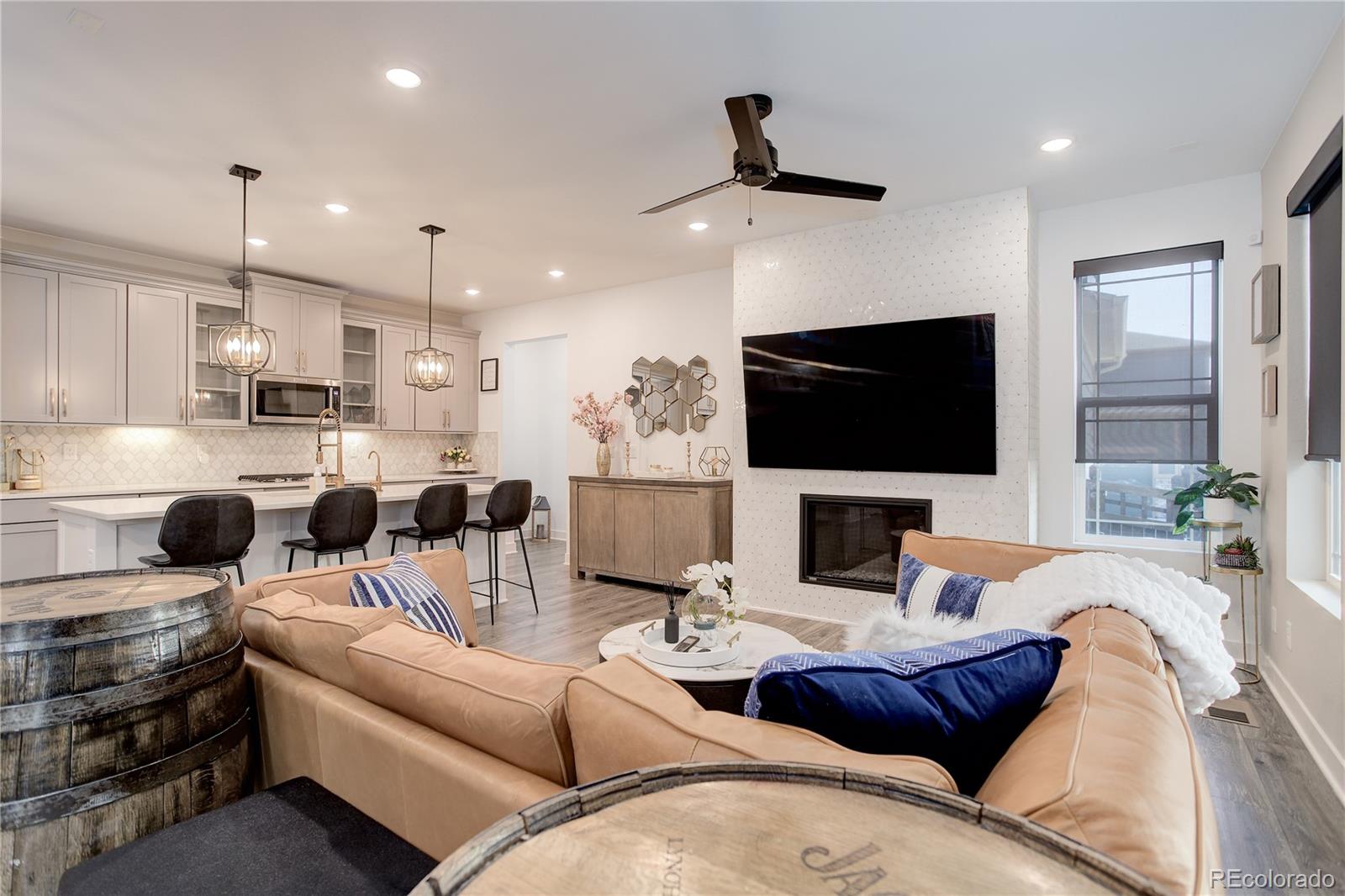 Step inside to an inviting open-concept living space showcasing a gourmet kitchen with sleek countertops, stylish cabinetry, a large walk-in pantry, and top-tier appliances. The living room is highlighted by a breathtaking floor-to-ceiling fireplace adorned with luxury upgraded tile. Just off the spacious dining area, a flexible den or office space adds extra versatility.