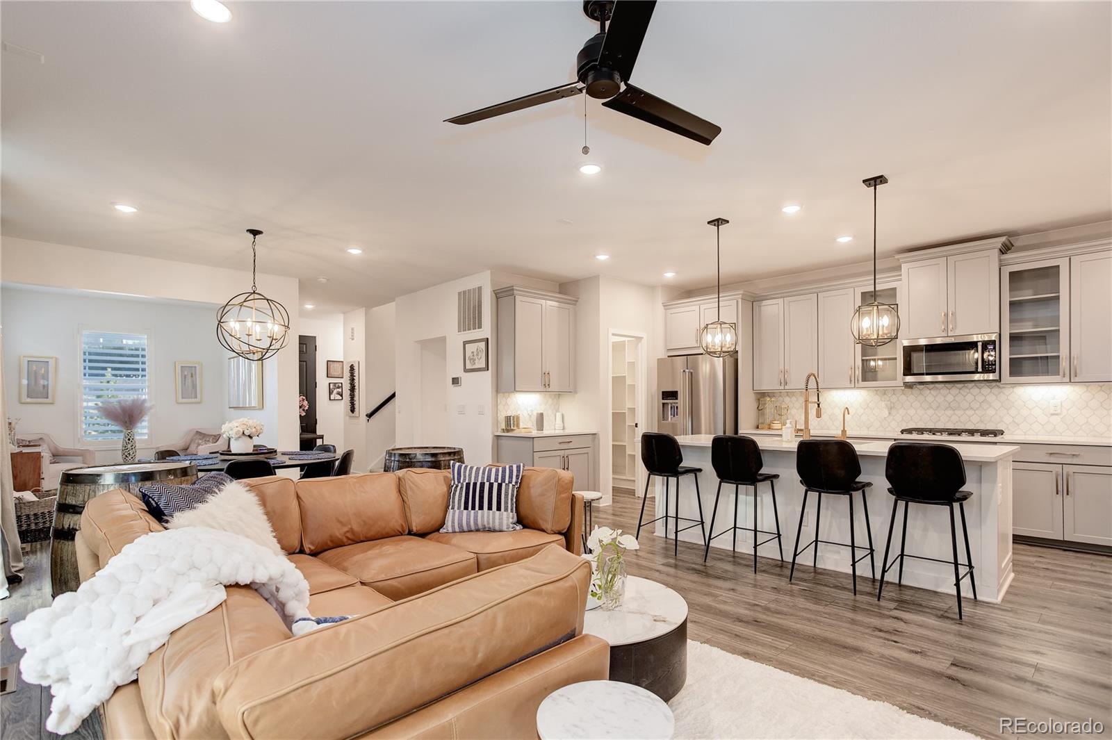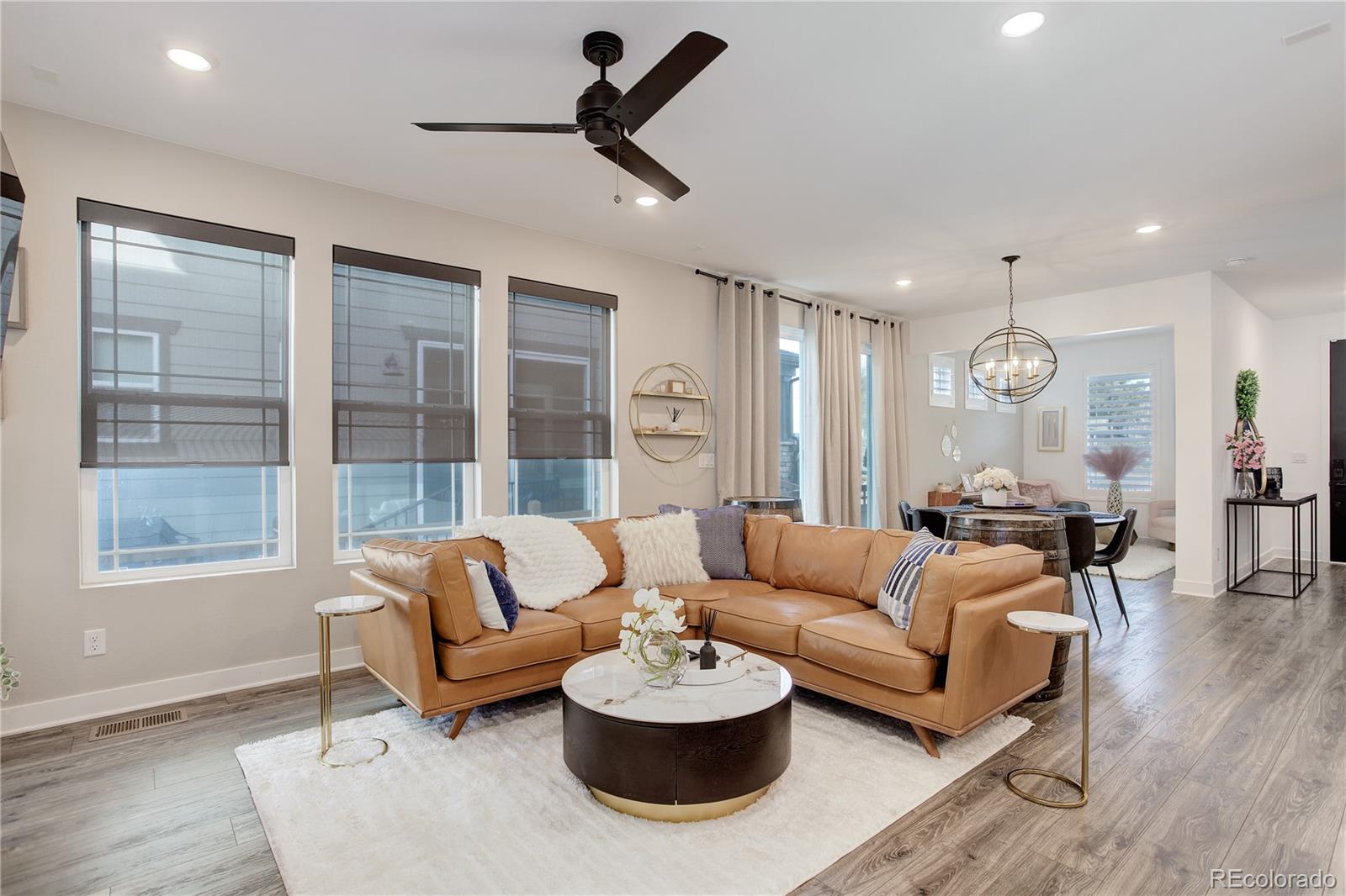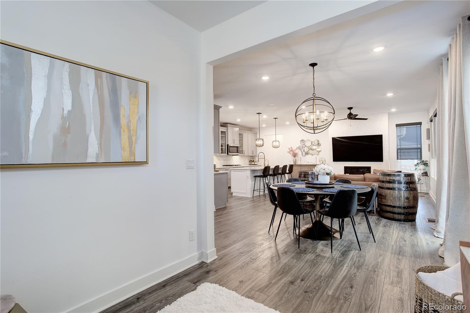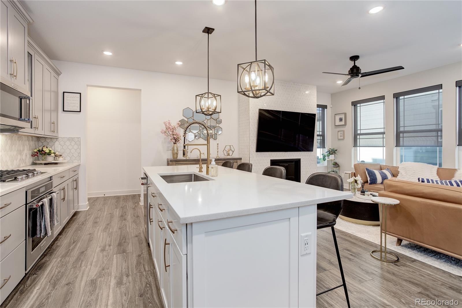 Step inside to an inviting open-concept living space showcasing a gourmet kitchen with sleek countertops, stylish cabinetry, a large walk-in pantry, and top-tier appliances. The living room is highlighted by a breathtaking floor-to-ceiling fireplace adorned with luxury upgraded tile. Just off the spacious dining area, a flexible den or office space adds extra versatility.