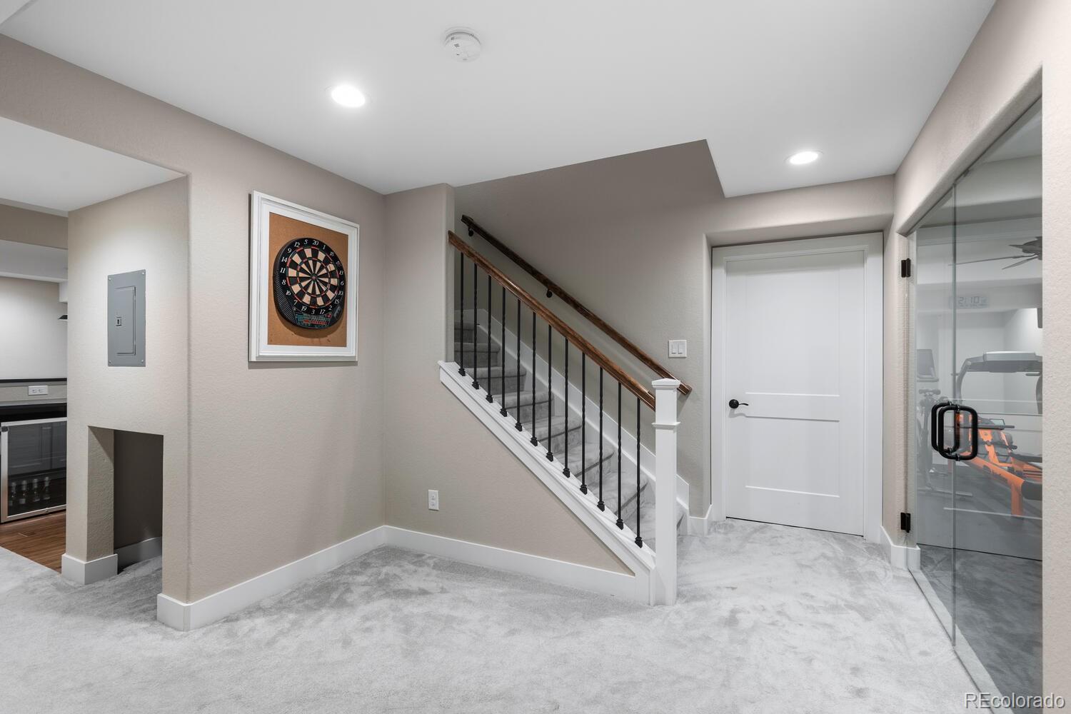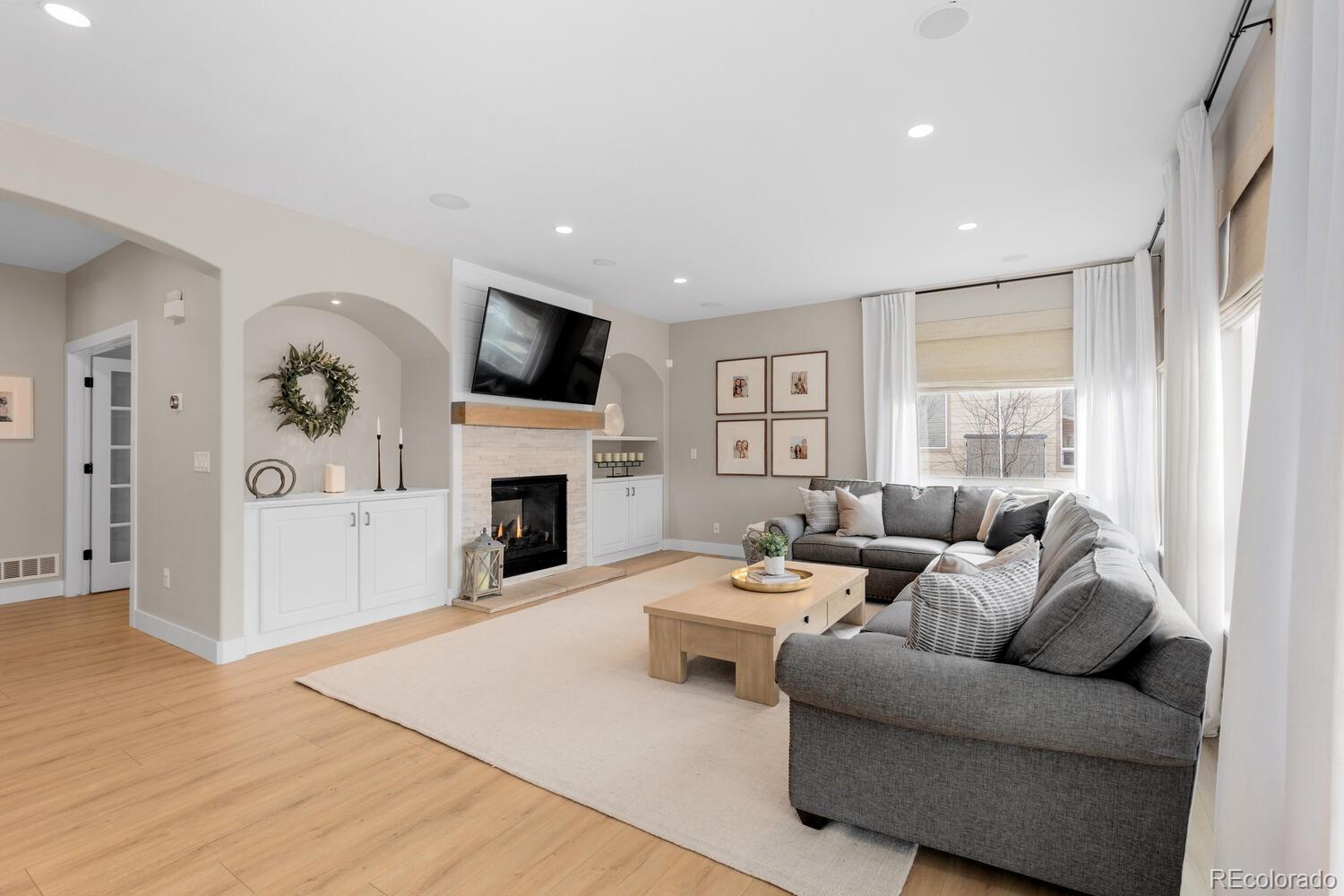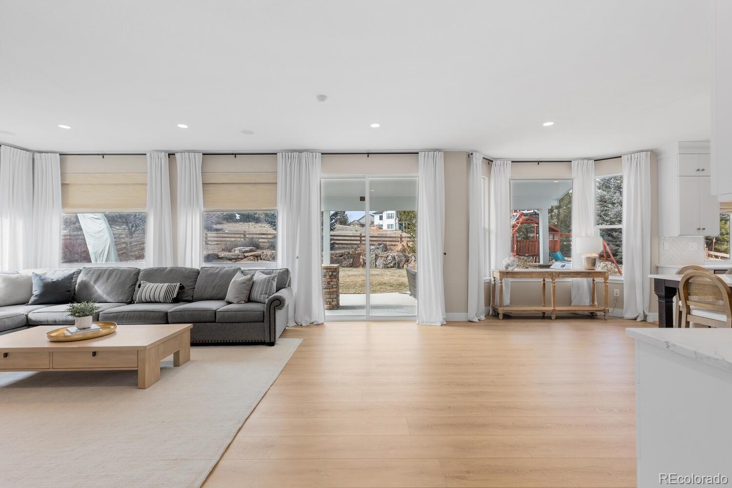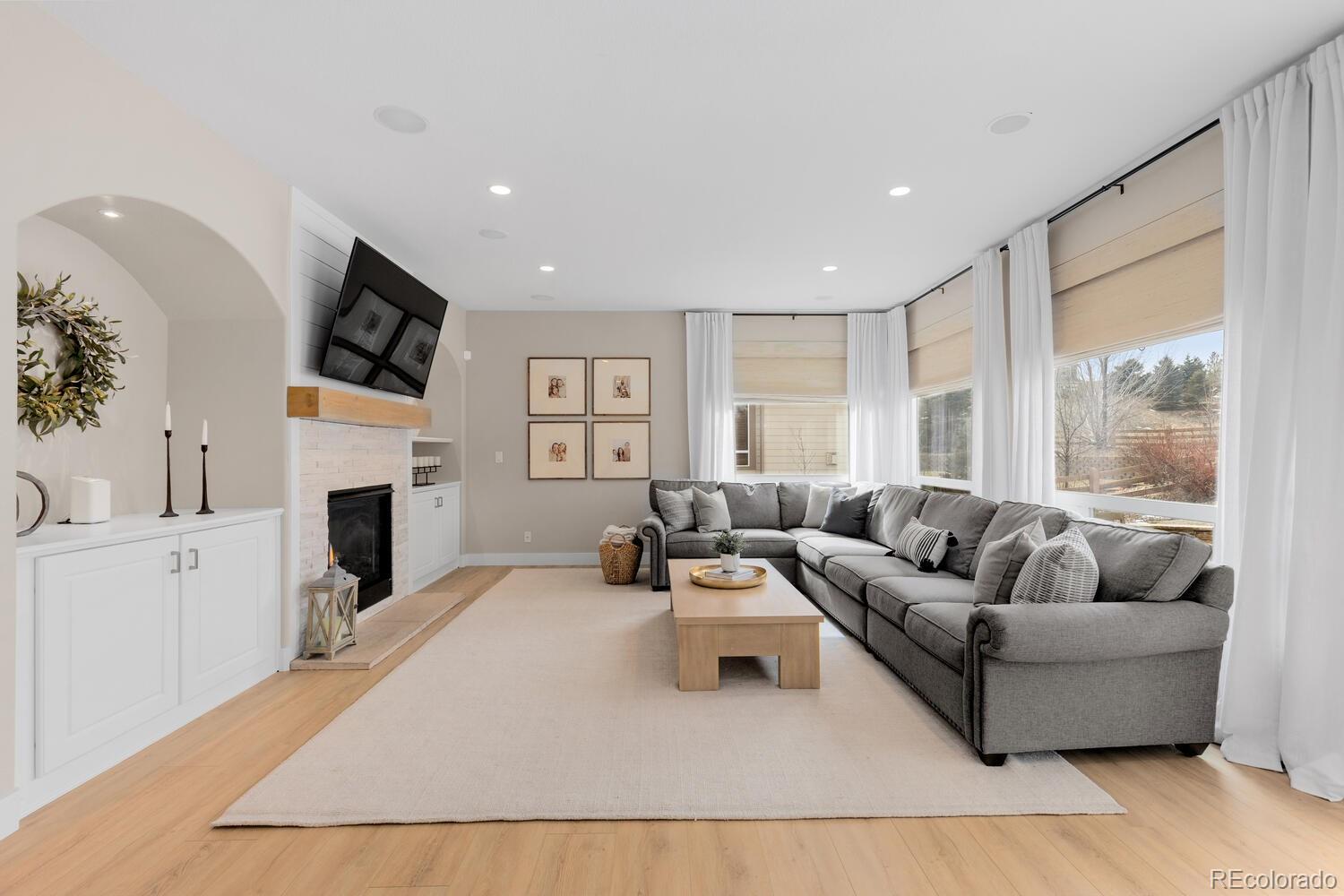 Modern luxury meets timeless sophistication in this stunning remodel in the highly coveted Pradera Golf Community! Perfectly situated on a third-acre lot backing to a greenbelt, this home blends expansive outdoor living with over $275K in thoughtful updates, making it truly one-of-a-kind.The striking curb appeal and welcoming front porch set the stage for the refined design inside. Step through the door to soaring vaulted ceilings, a dramatic curved staircase, light oak flooring, designer finishes, and a neutral palette that creates an inviting open concept flow. The gourmet kitchen is a showpiece, featuring high-end appliances, a custom wood vent hood, brass pot filler, expansive island, luxury wide plank flooring, and designer lighting. The dining room, great room, kids' office spaces, updated powder bath, and redesigned laundry/mudroom all flow seamlessly together for everyday function and entertaining alike. Upstairs, the master retreat offers a cozy fireplace, spa-like five-piece bath, and generous walk-in closet. Three additional bedrooms and two bathrooms complete the upper level. The finished basement adds nearly 1,800 SF of versatile living: a glass enclosed home gym, two bedrooms, a full bath, under-stair play nook, and a family room with a built-in bar--perfect for movie nights or entertaining. The oversized three-car garage provides extra storage for all your gear, while the backyard retreat boasts a covered patio with fire pit, outdoor kitchen, and built-in basketball hoop for endless enjoyment. Living in Pradera means access to premier community amenities including trails, open space, playgrounds, pool, parks, and an optional golf membership. All with easy access to I-25, DTC, Castle Rock, shopping, dining, and more!