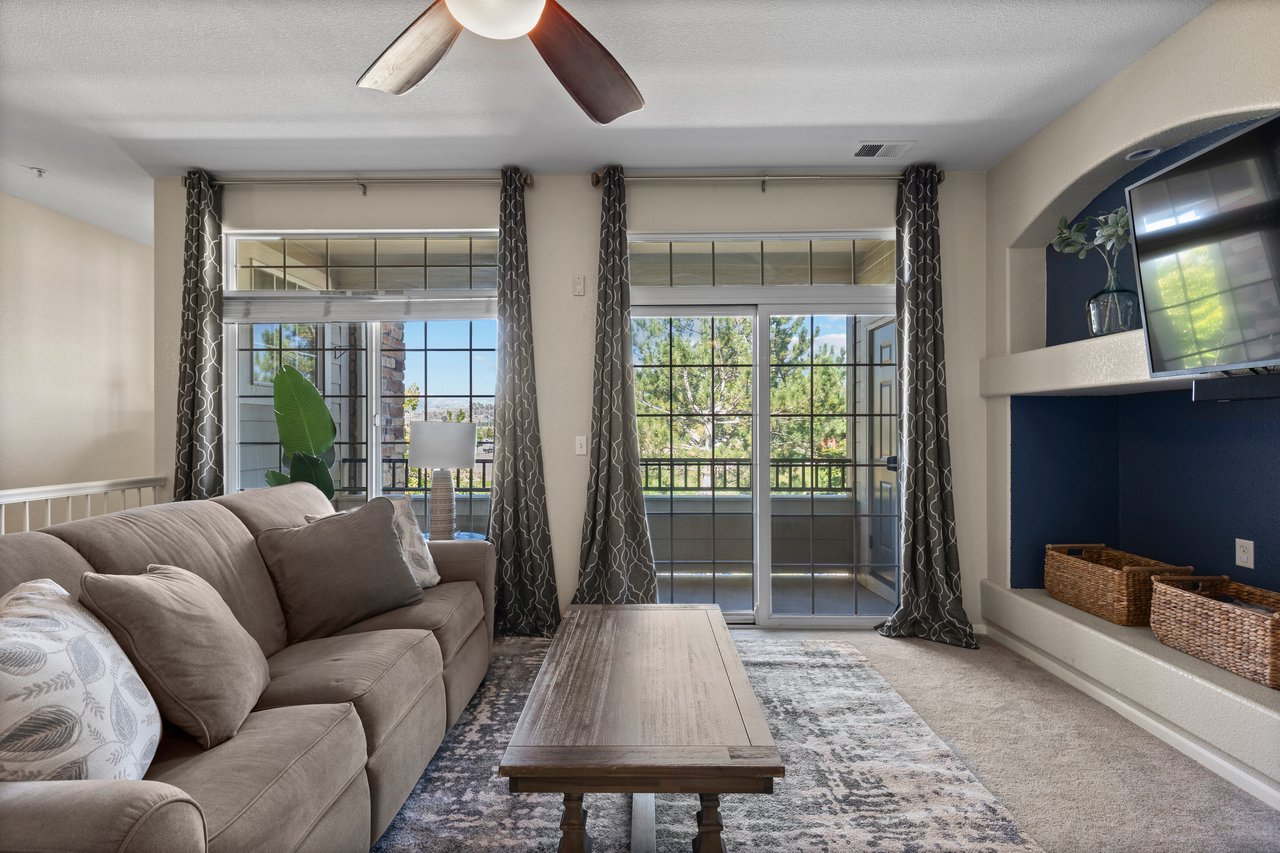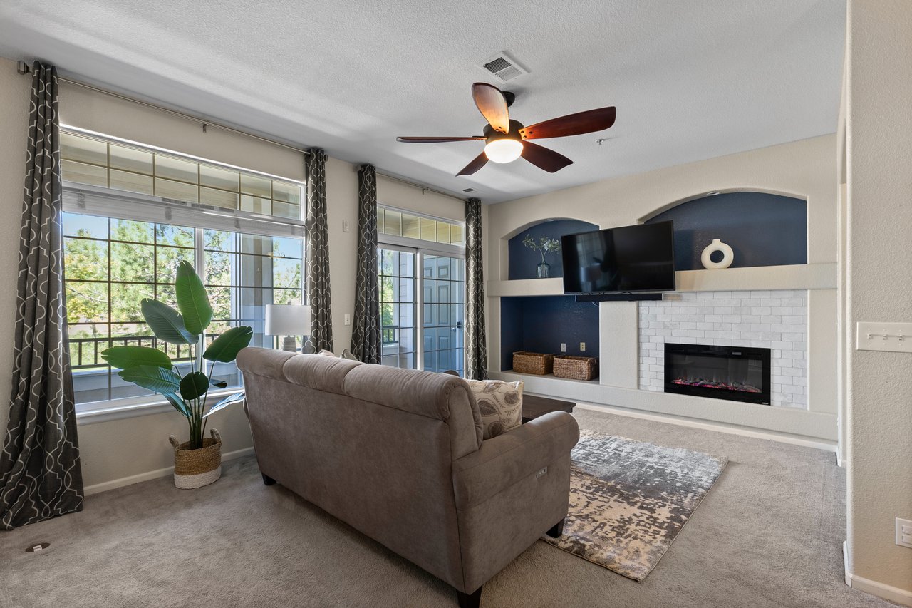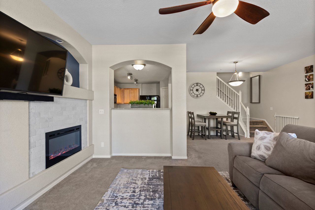 Welcome home to this beautifully updated 2-bedroom, 2-bathroom condo with a garage and parking space, located in the heart of Castle Rock! Bursting with charm, natural light, and modern upgrades, this move-in-ready home offers both comfort and convenience in one of the best locations in the community. Inside, you'll love the open-concept layout that seamlessly connects the kitchen, dining, and living spaces; perfect for entertaining or relaxing nights at home. The stylish kitchen features neutral light oak cabinets, ample counter space, a new sink and a huge walk-in pantry. The bright and welcoming living room includes a cozy fireplace and opens to a spacious private balcony--a perfect spot to enjoy the Colorado sunshine. Upstairs, you'll find two generous bedrooms, two bathrooms and a convenient laundry room. The primary suite is a standout with vaulted ceilings, dual closets, and stunning views. Additional highlights include; a whole home Halo water filtration system, a one-car detached garage and an extra reserved parking space. This peaceful community offers top-tier amenities: pool, hot tub, clubhouse, fitness center, and direct access to scenic walking and biking trails. All just minutes from the Castle Rock Outlets, vibrant downtown dining, shopping, Metzler Ranch skate park and baseball diamonds and quick access to I-25 for easy commuting.