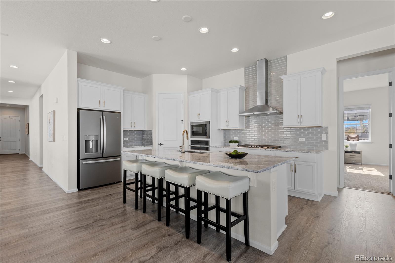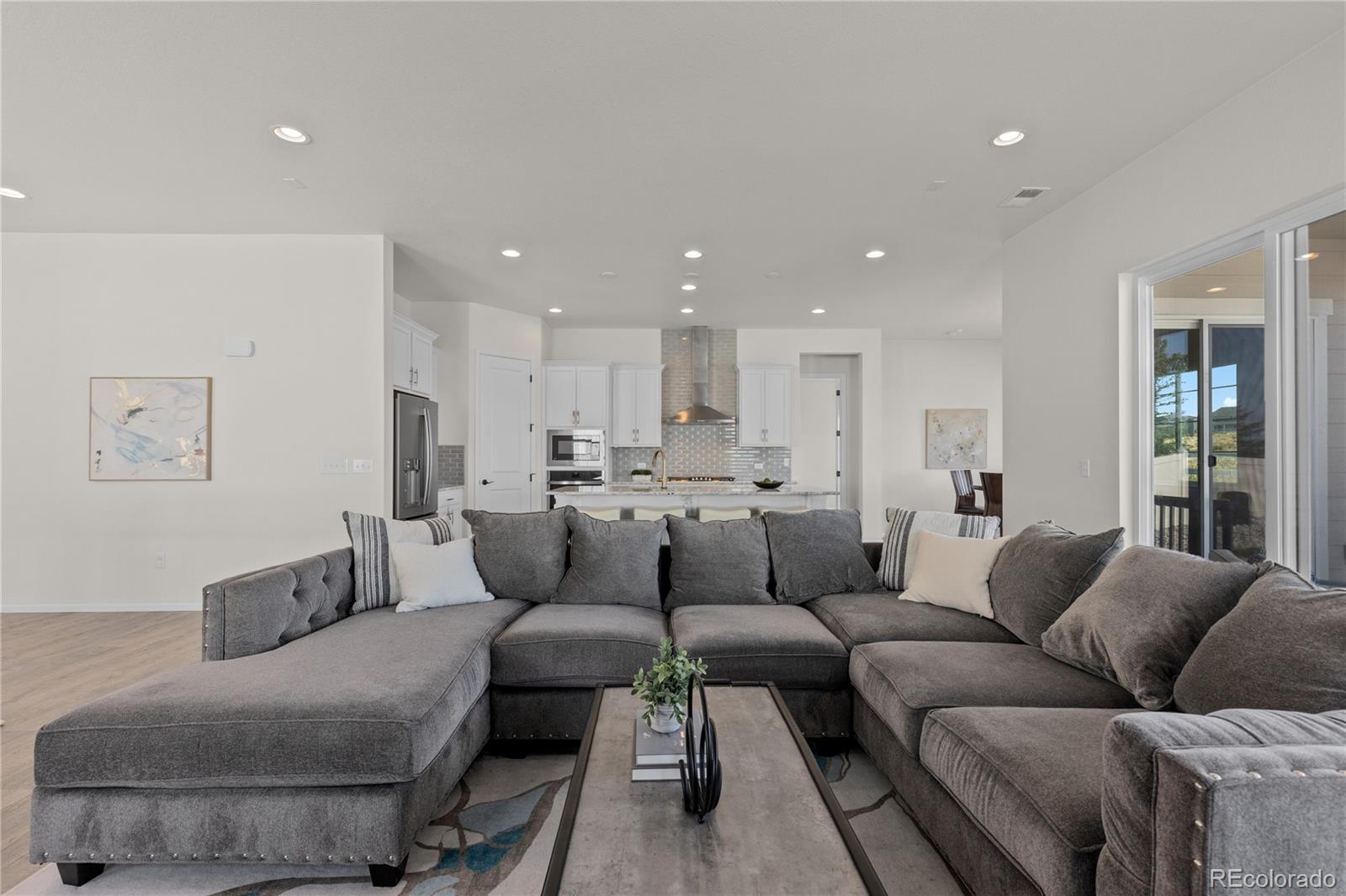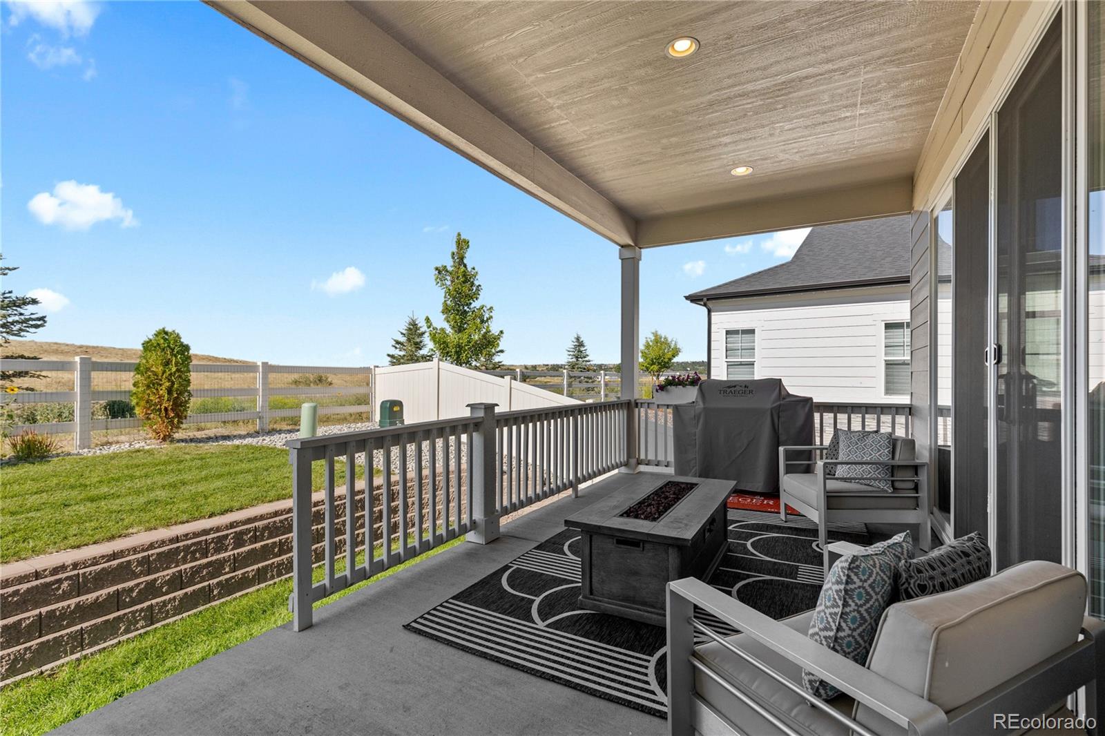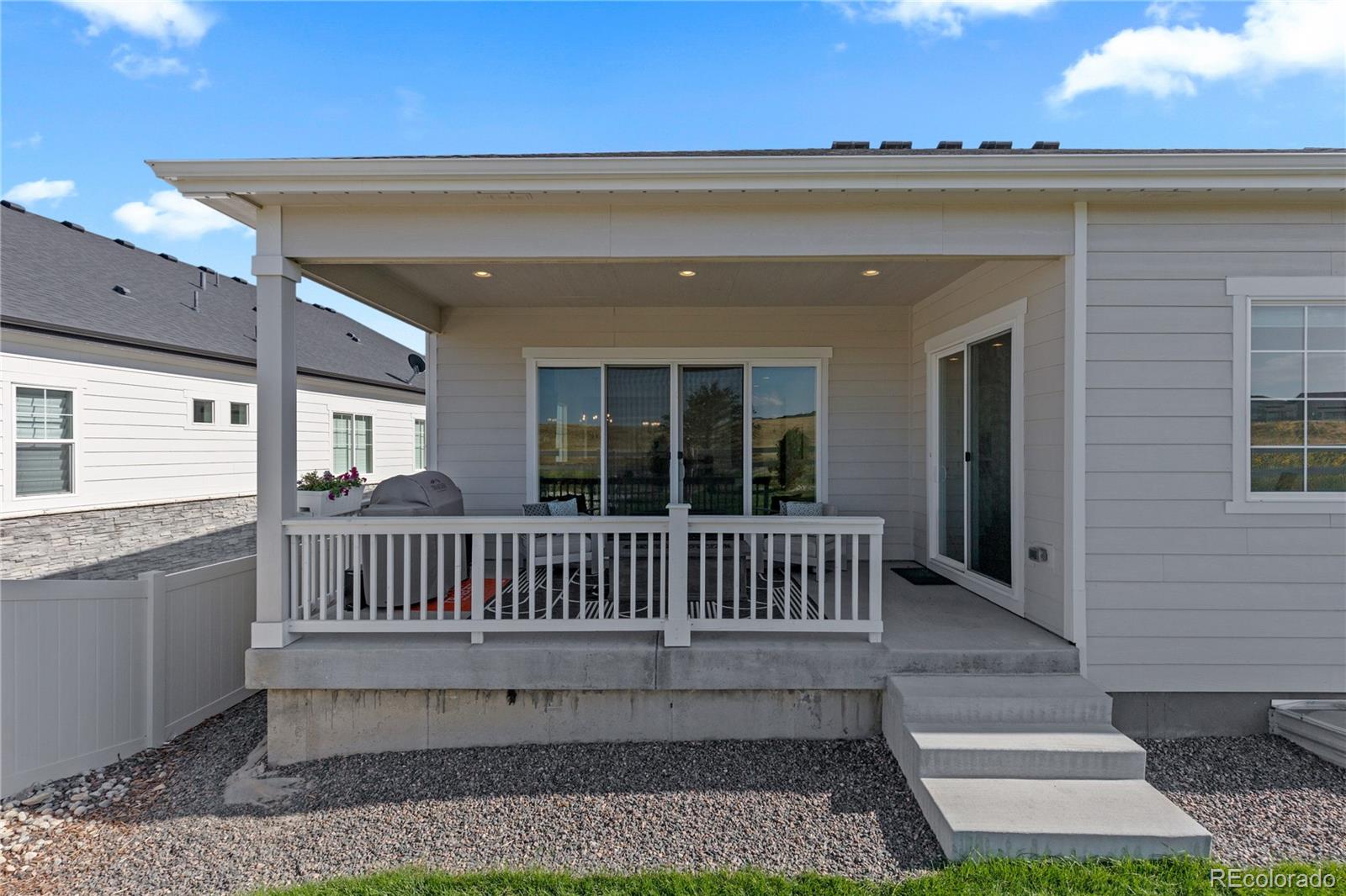 Set within the scenic enclave of Stone Creek Ranch, this 2022 ranch-style home captures sweeping views of Colorado's rolling hills and offers a sophisticated take on modern, main-floor living. Expansive windows bathe the main level in natural light, creating a warm and welcoming atmosphere equally suited for quiet mornings and effortless entertaining. The chef's kitchen is the true centerpiece, featuring an oversized island, timeless subway tile backsplash, stainless steel appliances, and a walk-in pantry. The space flows seamlessly into the dining area and great room, where a sleek fireplace provides a stylish focal point. Sliding glass doors invite indoor-outdoor living and frame the surrounding landscape. The primary suite serves as a serene retreat with peaceful views, a spa-inspired bathroom, and a generous walk-in closet. The finished lower level expands the home's versatility, offering a wet bar, media area, and flexible spaces ideal for guests, a home gym, or creative pursuits. Additional highlights include a three-car garage, solar panels, and thoughtful designer finishes throughout. Residents also enjoy access to outstanding community amenities, including a pool, clubhouse, parks, and trails. This exceptional home delivers modern comfort, functionality, and outstanding value--main-floor living at its finest.