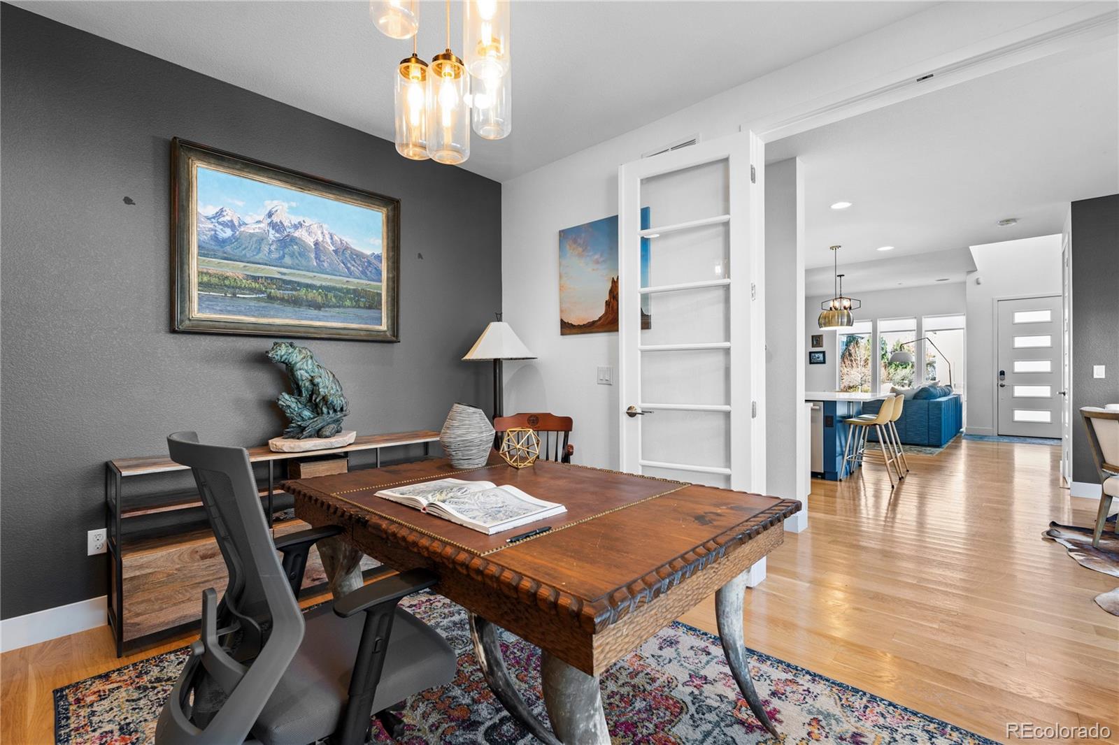 Nestled on a landscaped corner lot in Central Park, this home by Infinity Properties lives with ease and intention. Tall ceilings and generous windows shape an open main level that moves naturally from the eat-in kitchen to the dining area and family room. Stacked white cabinetry with gold hardware, a built-in refrigerator, and a large island set the tone for everyday cooking and weekend hosting. French doors open to a quiet main-floor study for work or reading. Upstairs, an airy loft connects two secondary bedrooms, a full bath, and the laundry room, with the primary retreat set apart. The finished basement adds a bedroom and full bath for guests, fitness, or movie nights.